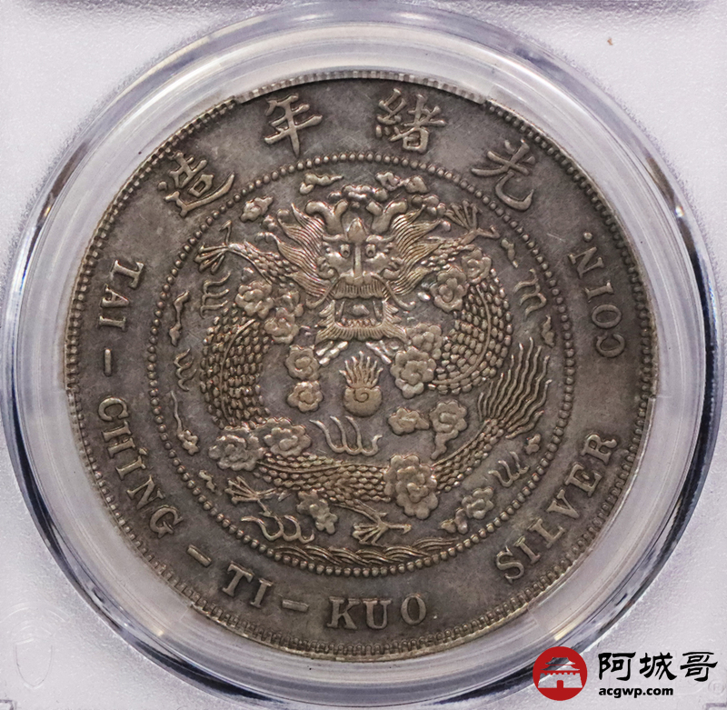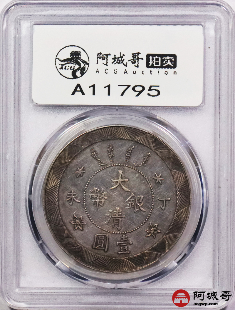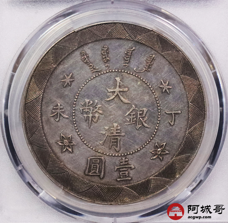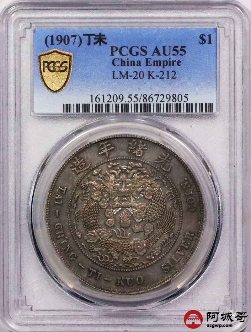 Lot:3030 1907光绪年造丁未大清壹圆银币一枚, 度支部天津造币总厂试铸,未发行,铸额无多。制作工艺精良,异于常品,打制压力十足,图案清晰深峻,边齿马齿峭拔锐利,醇厚灰色包浆,状态自然舒服 PCGS AU55