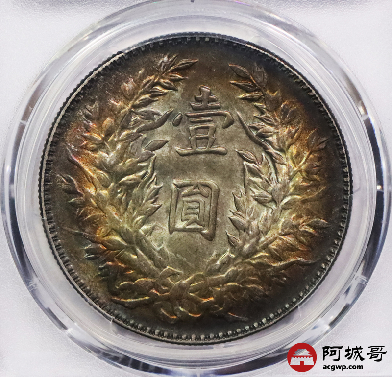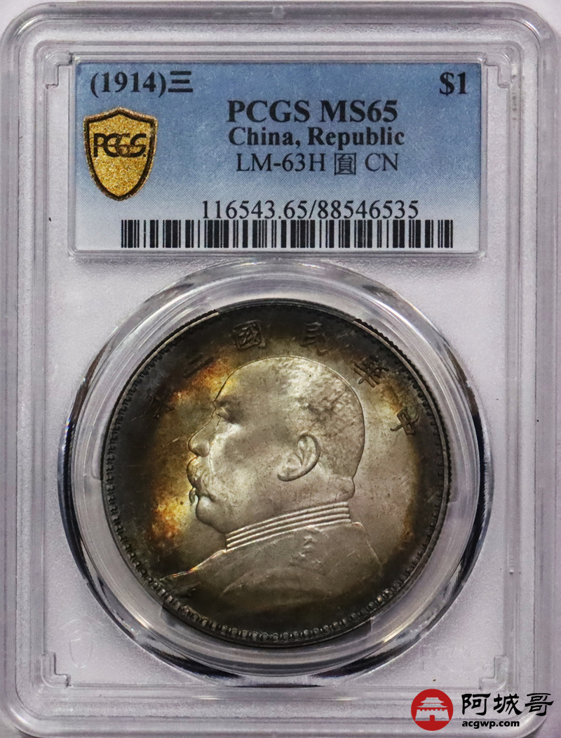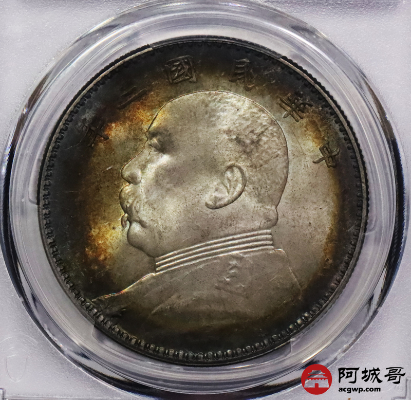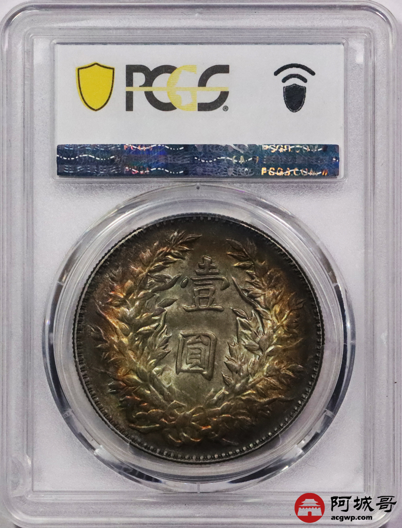 Lot:3126 1914民国三年袁世凯像壹圆银币一枚,卷首环五彩,字面浓重酱五彩包浆,三角圆版PCGS MS65