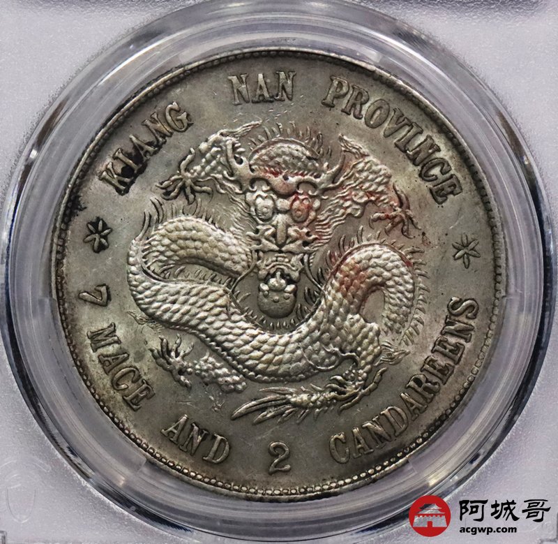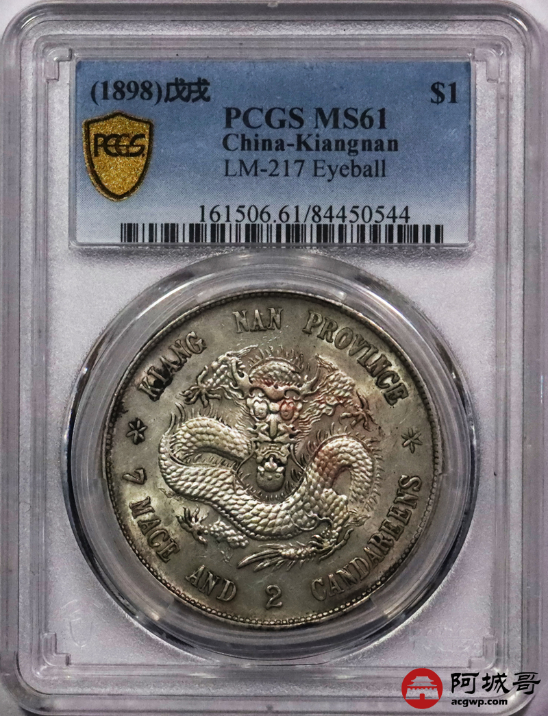 Lot:3361 1898戊戌年江南省造光绪元宝库平七钱二分银币一枚,原味黄油底板,龙鳞饱满,字口锐利,状态一流 PCGS MS61