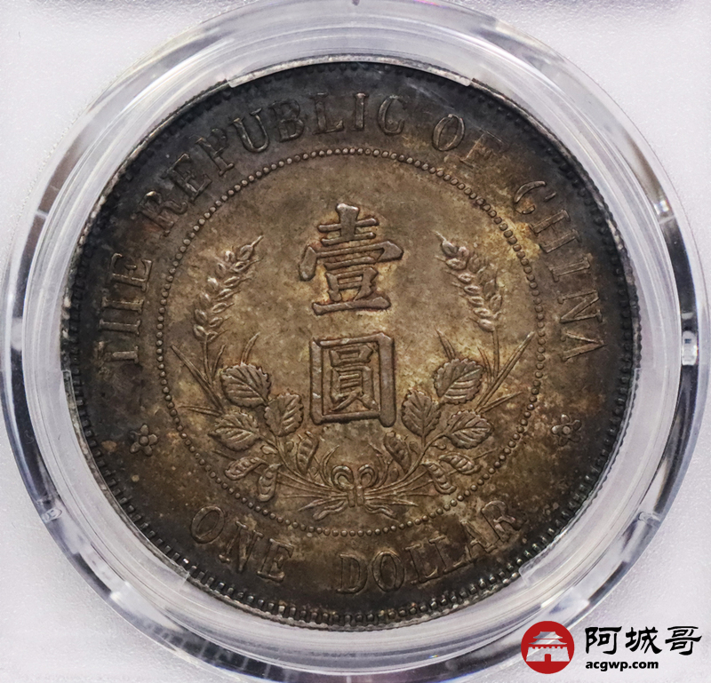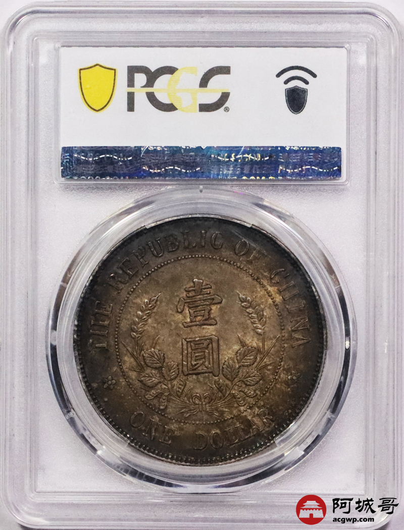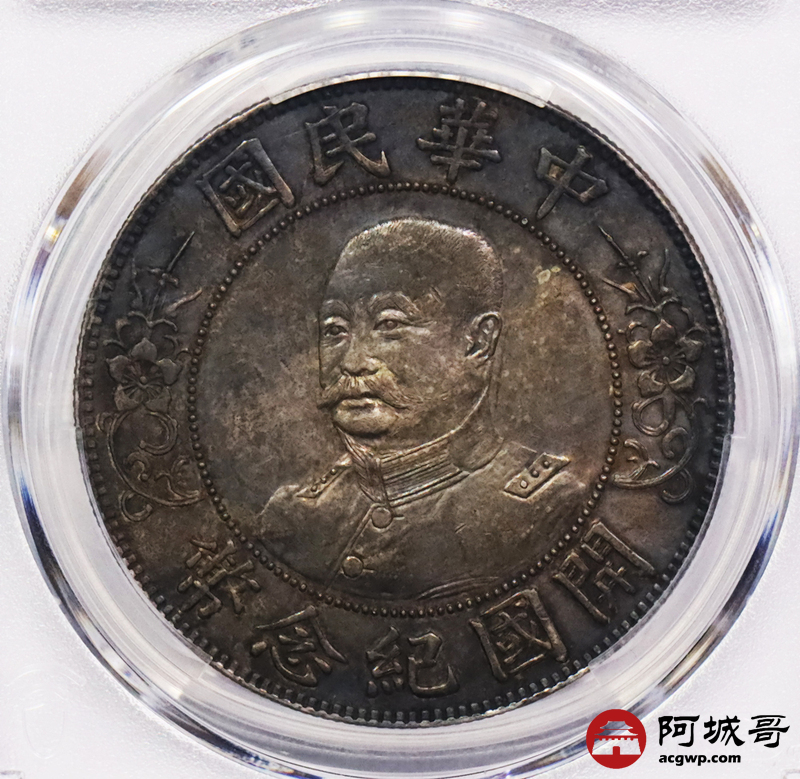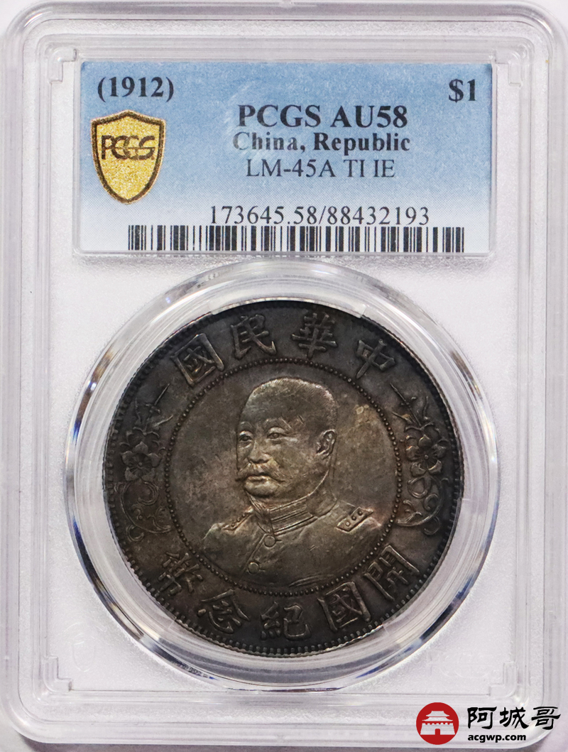 Lot:3096 1912黎元洪像无帽开国纪念壹圆银币一枚,双面入骨酱彩包浆,底板全深打,味道舒服 PCGS AU58