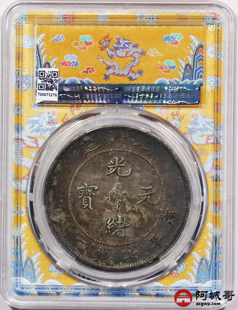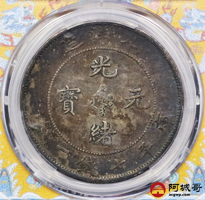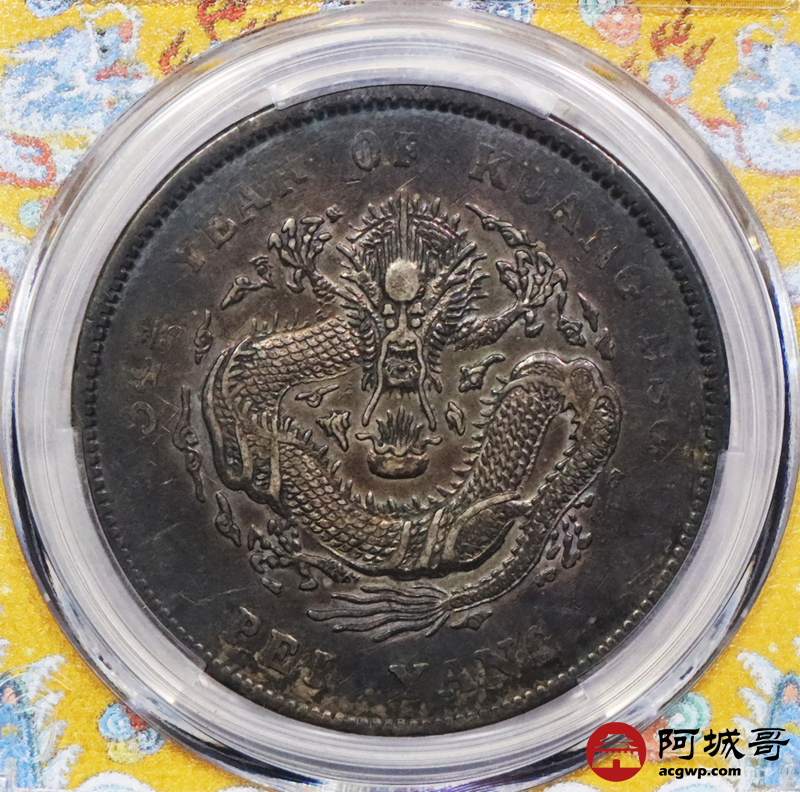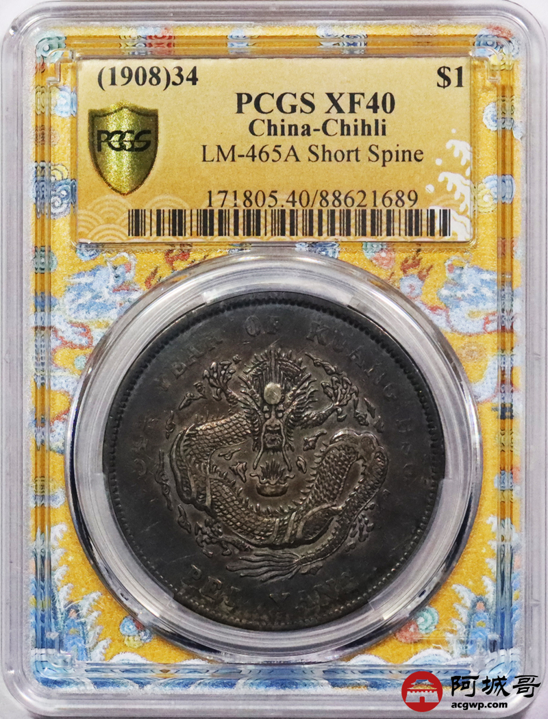 Lot:3310 1908光绪三十四年北洋造光绪元宝库平七钱二分银币一枚,酱彩包浆,短尾龙版PCGS XF40