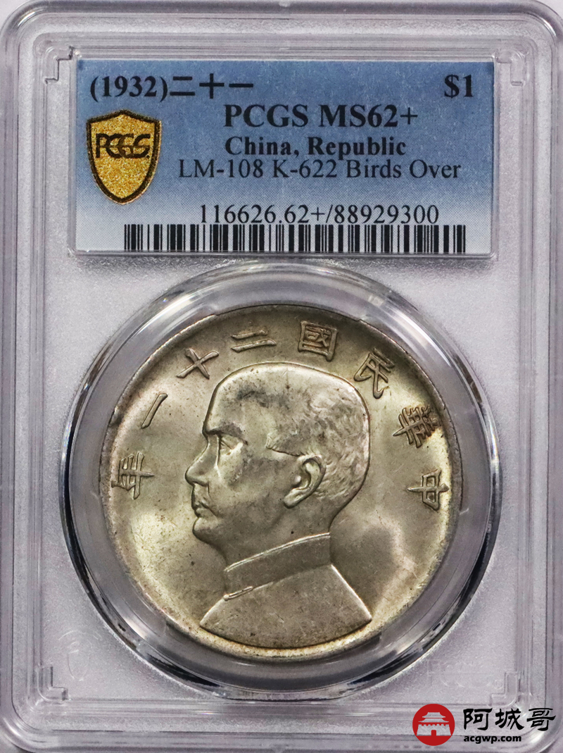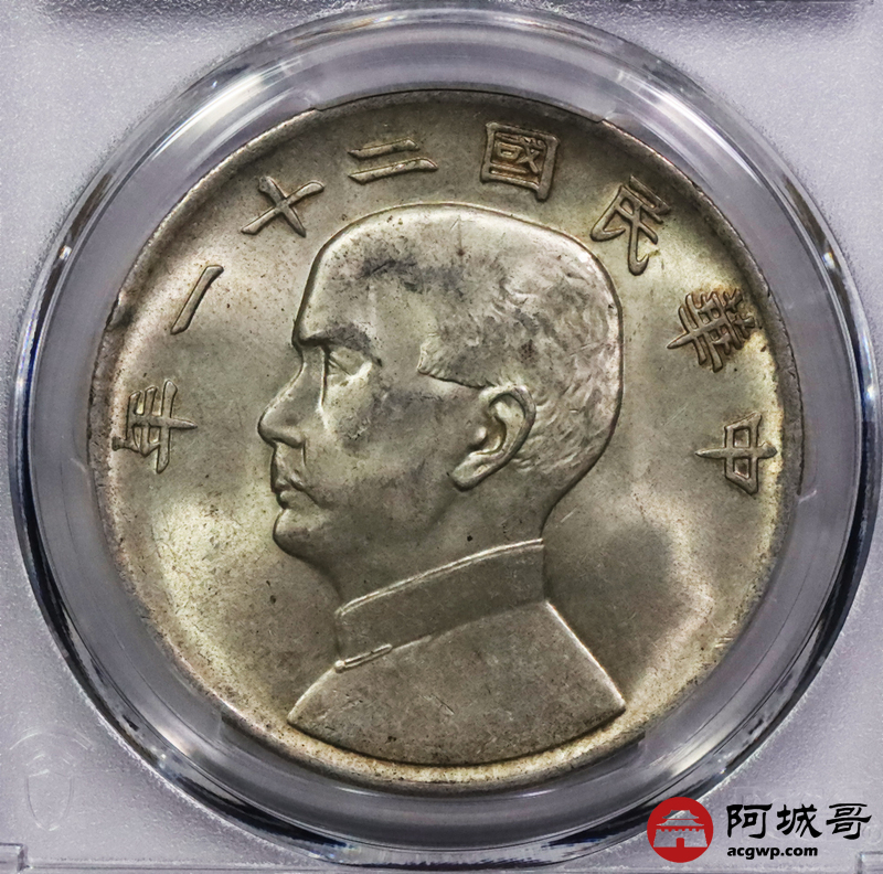 Lot:3192 1932民国二十一年孙中山像背三鸟壹圆银币一枚,黄油原味底板,状态佳 PCGS MS62+