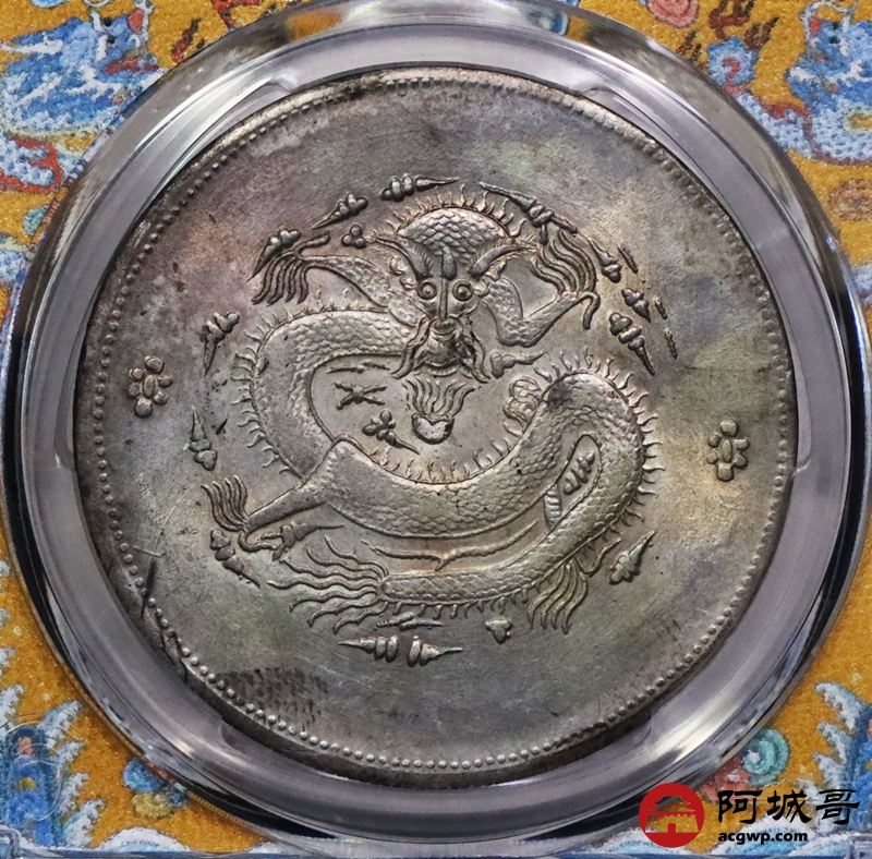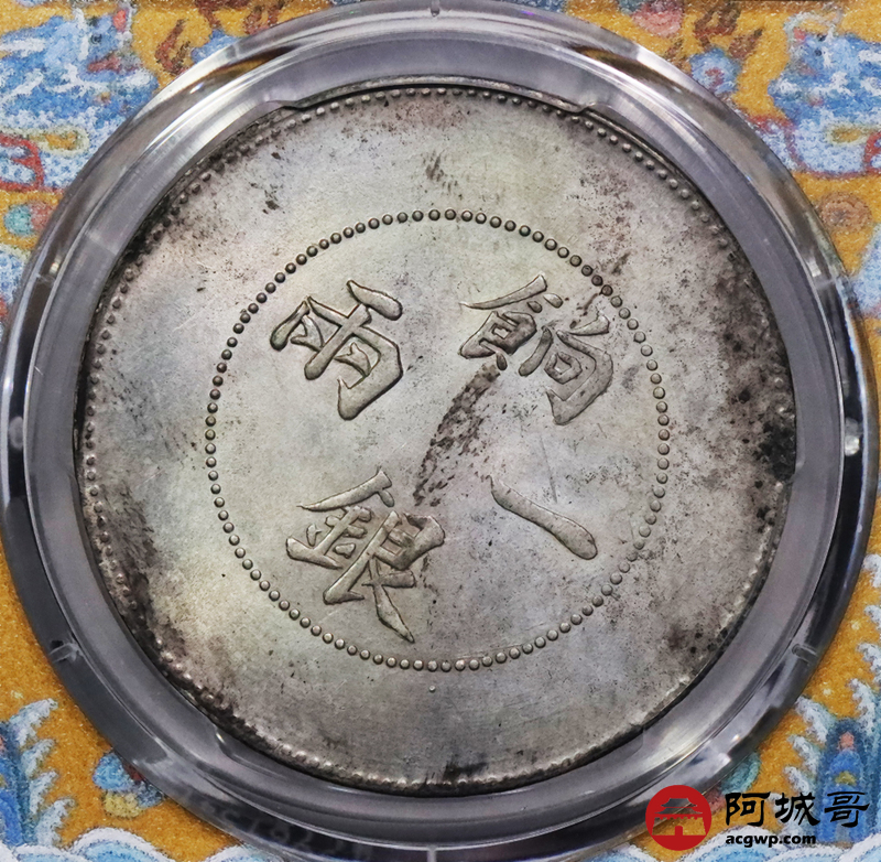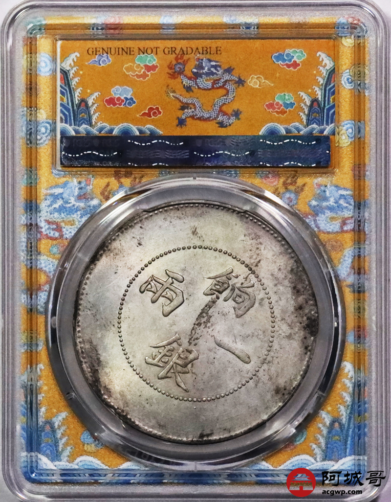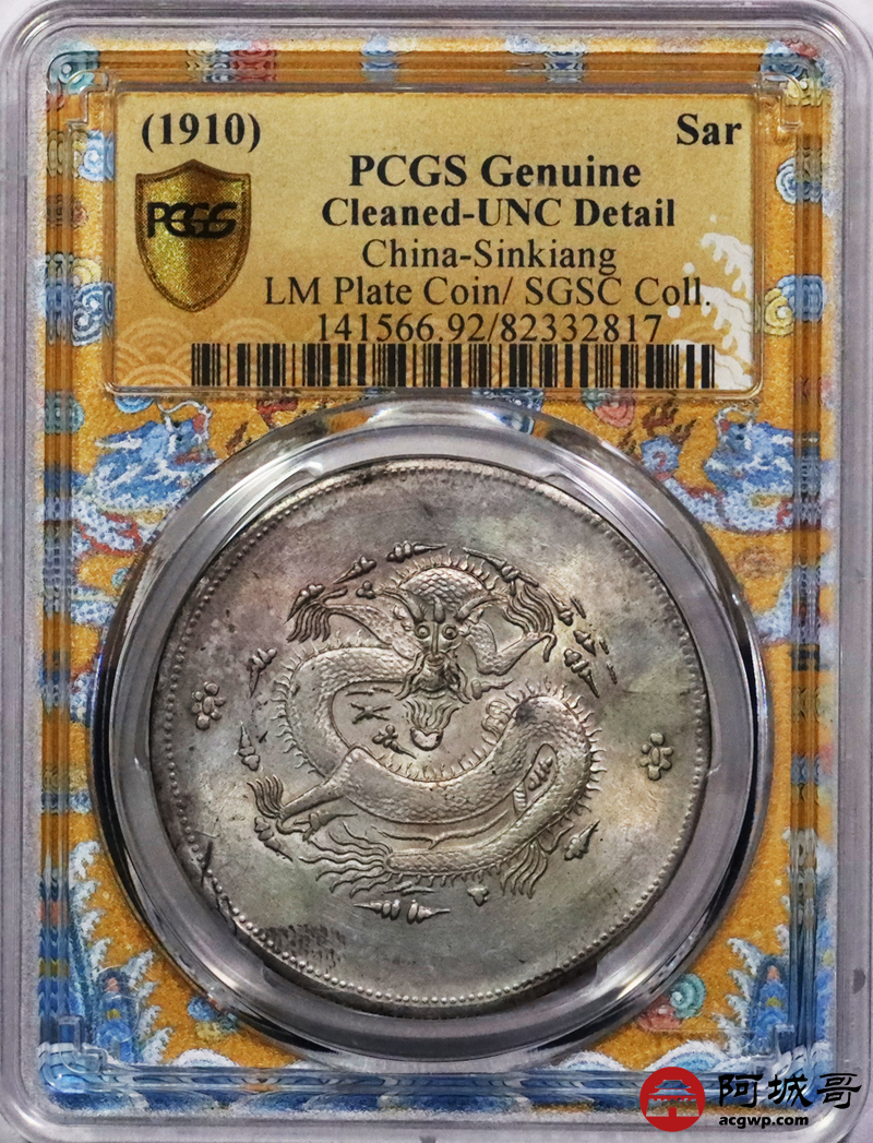 Lot:3450 1910新疆省造饷银一两银币一枚,字口深打,淡彩原光底板 边境瑰宝书中原物,名家旧藏。 《新疆金银币图说》和《边境瑰宝》书中原物,名家旧藏,流传有序,全龙鳞状态。PCGS UNC
