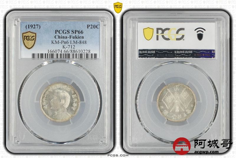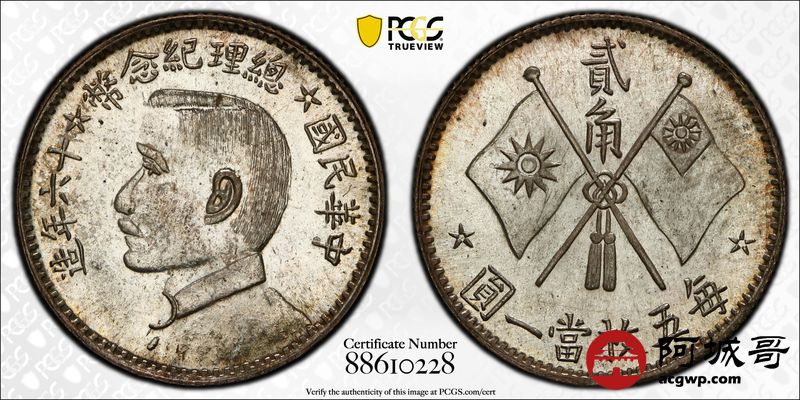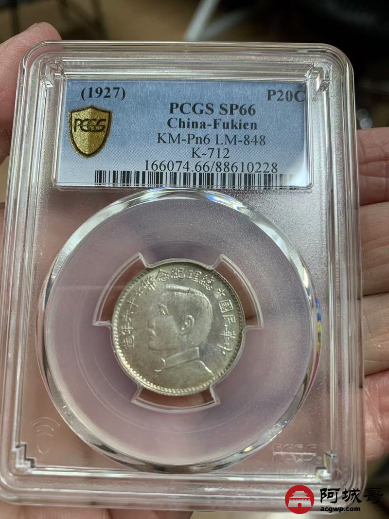 Lot:3220 1927民国十六年孙中山像总理纪念贰角银质样币一枚,镜面丝滑底板,压力十足 PCGS SP66