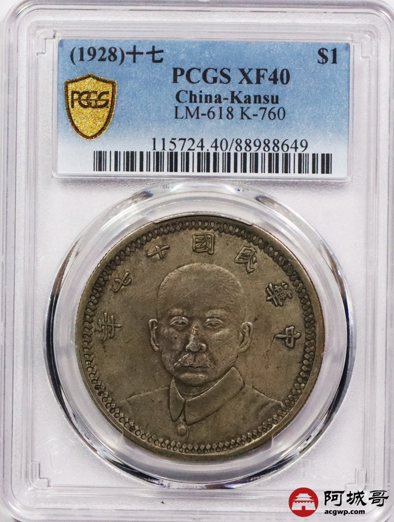 Lot:3217 1928民国十七年孙中山像甘肃省造壹圆银币一枚,原汁原味老包浆,味道舒服 PCGS XF40