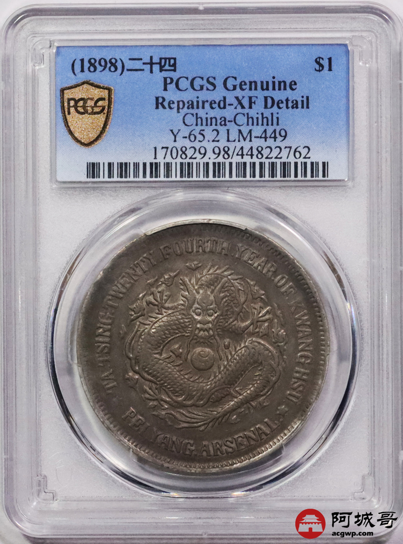 Lot:3269 1898光绪二十四年北洋机器局造大清壹圆银币一枚,原味包浆PCGS XF