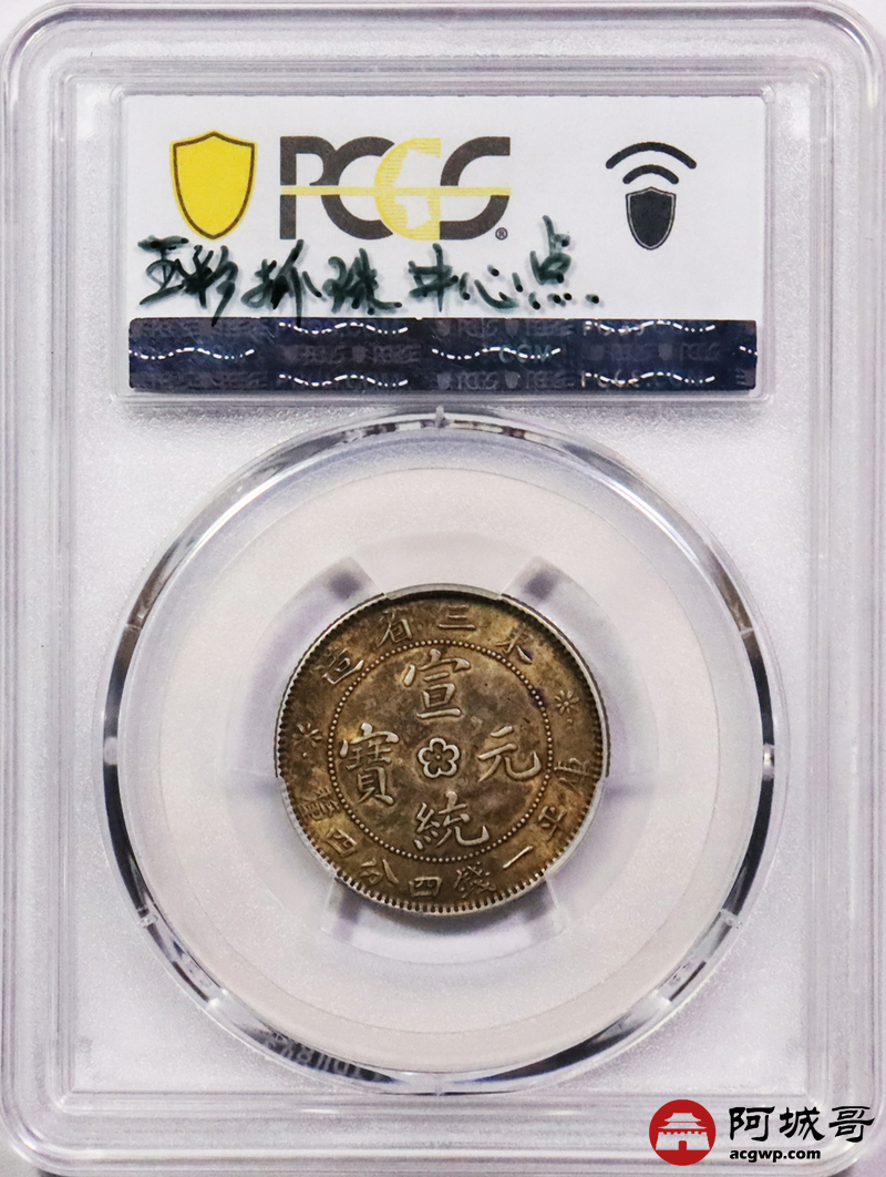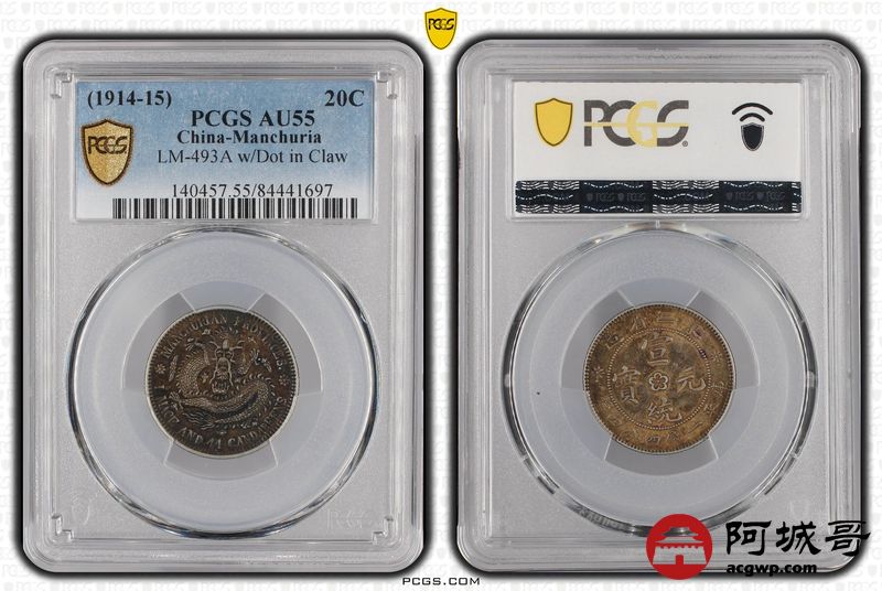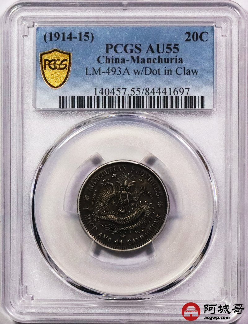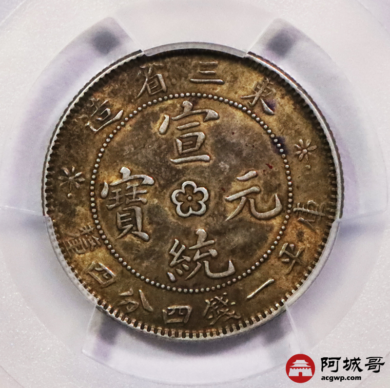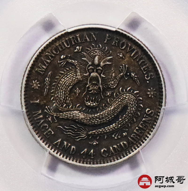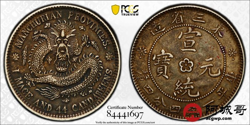 Lot:8 浓郁黑红老五彩 东三省宣统一钱四分四厘 龙抓珠 PCGS AU55
