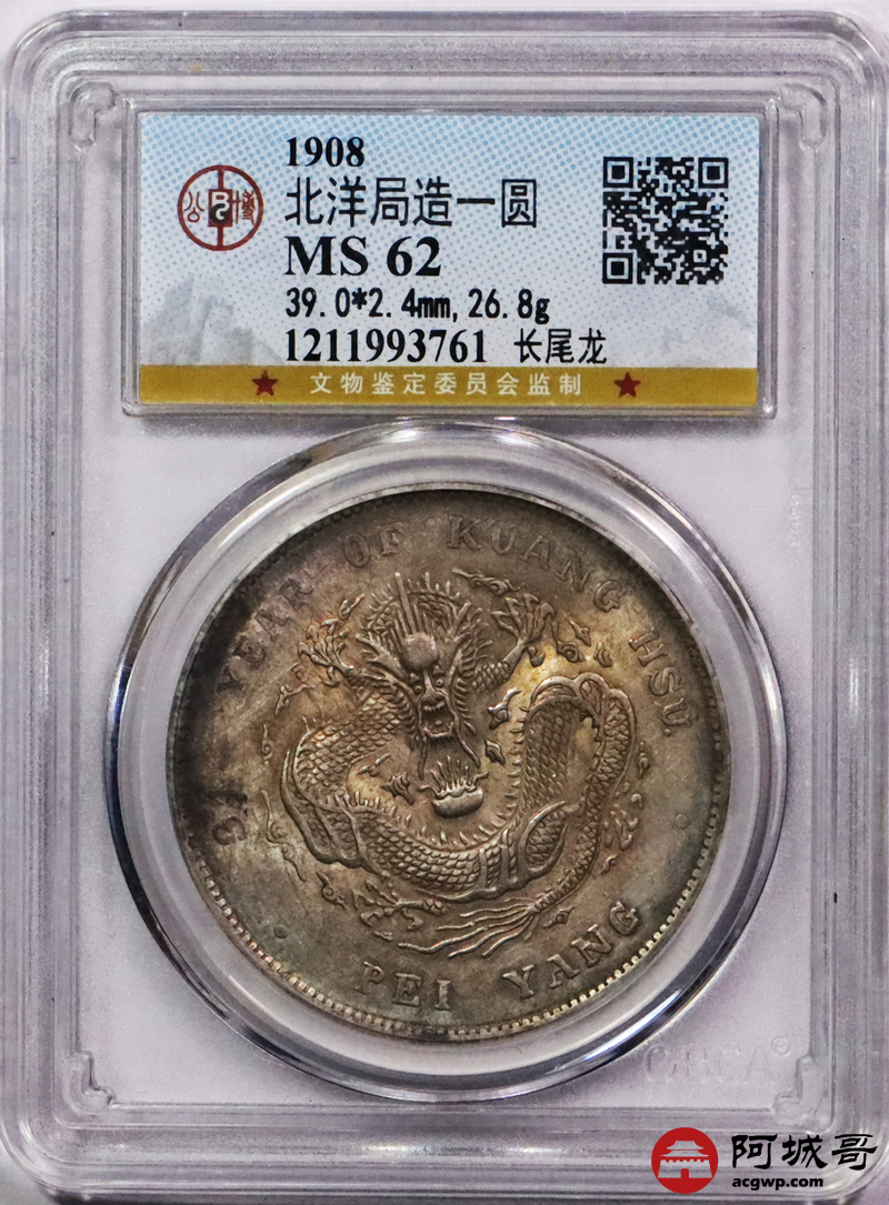 Lot:25 原光 五彩 北洋34年七钱二分短尾龙 公博 MS62