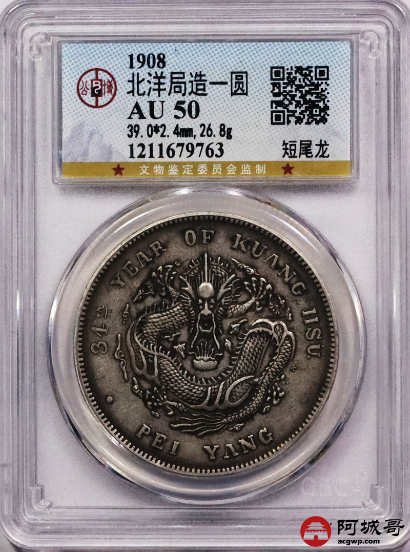 Lot:6 老包浆 高额头深打 北洋34七钱二分 短尾龙 公博 AU50