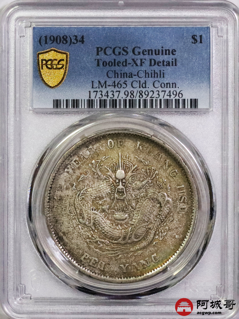 Lot:5543 1908光绪三十四年北洋造光绪元宝库平七钱二分银币一枚PCGS XF98评级编号:89237496