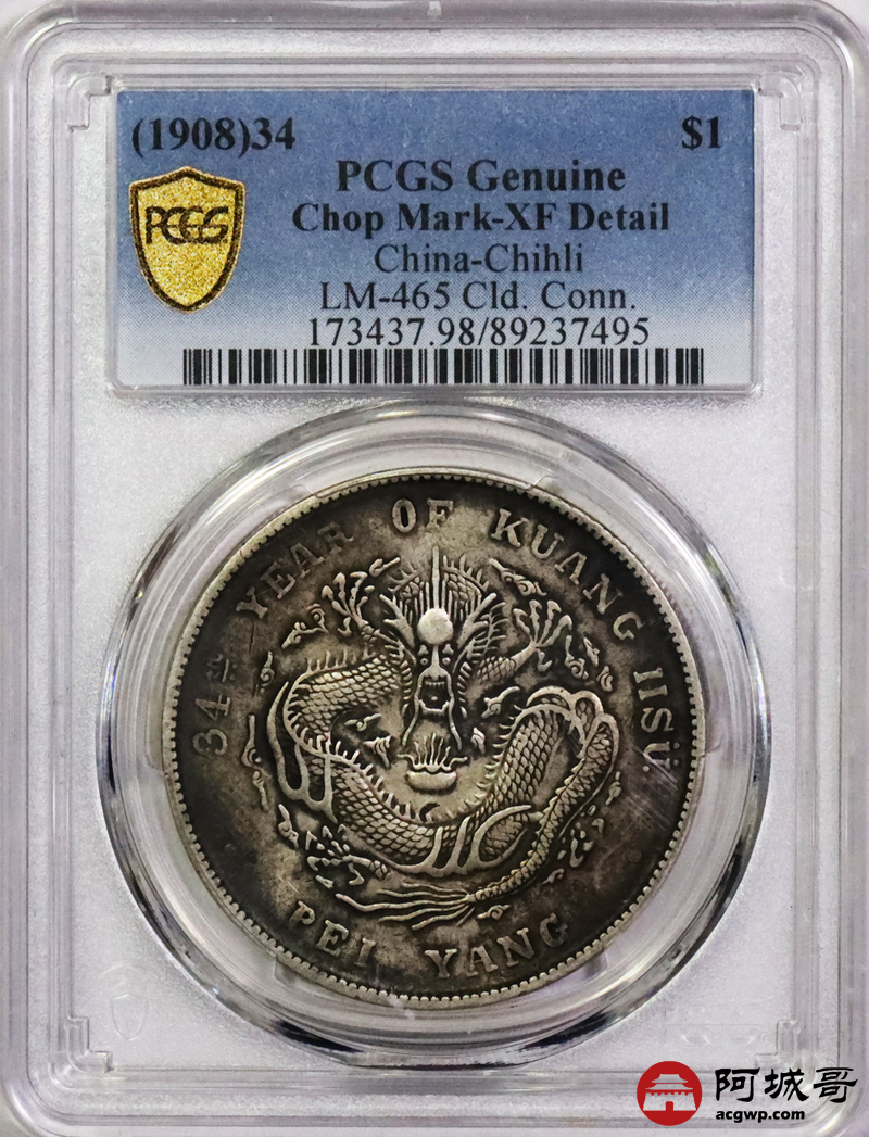 Lot:5546 1908光绪三十四年北洋造光绪元宝库平七钱二分银币一枚PCGS XF98评级编号:89237495