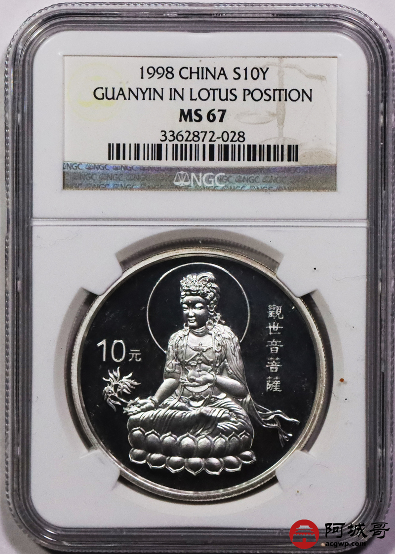 Lot:18 1998 观世音菩萨10元银币 NGC MS67