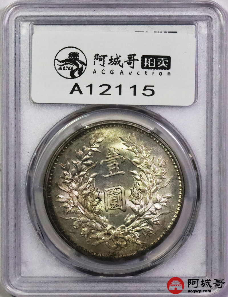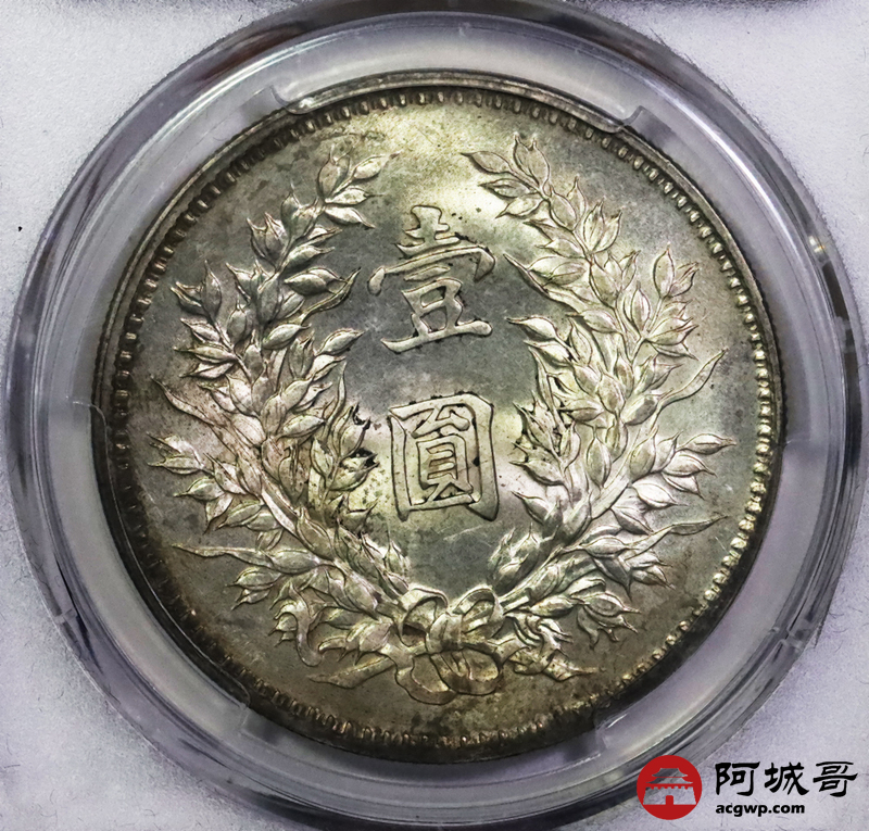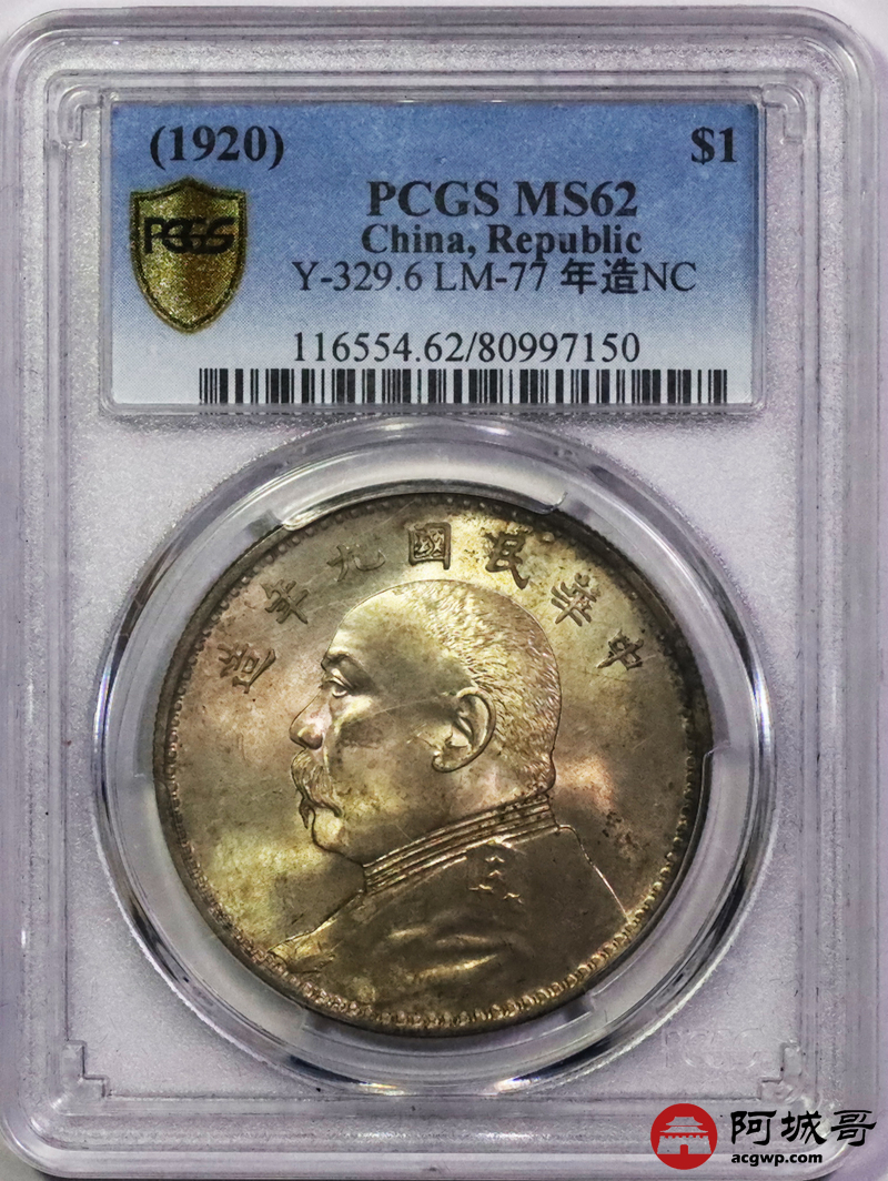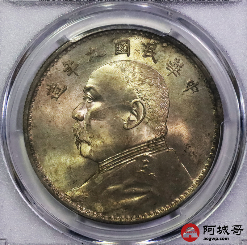 Lot:5292 1920民国九年袁世凯像壹圆银币一枚,精发版,金彩原光 PCGS MS62 评级编号:80997150