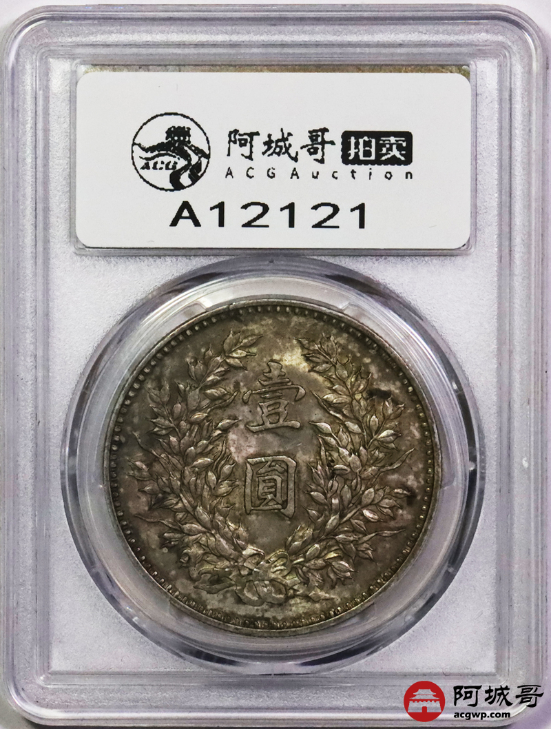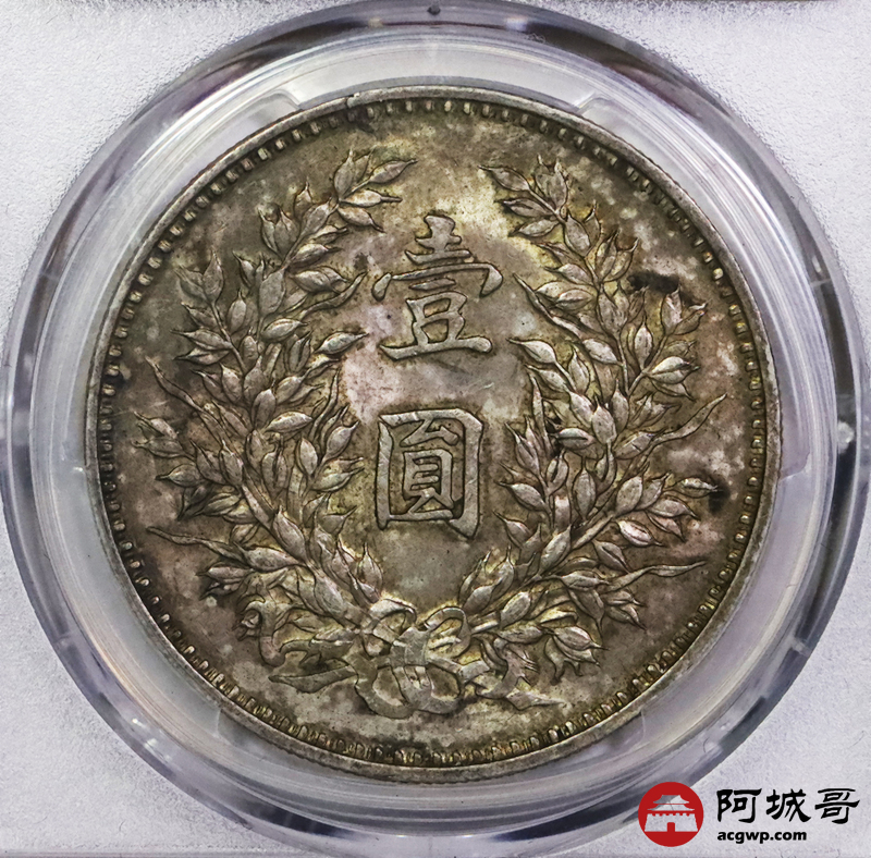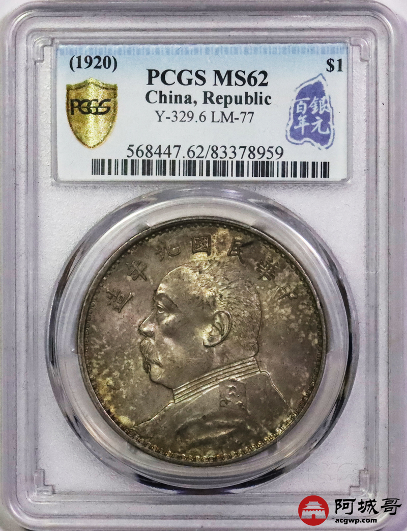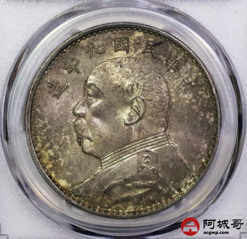 Lot:5288 1920民国九年袁世凯像壹圆银币一枚,精发版,油彩底板 PCGS MS62 评级编号:86471720