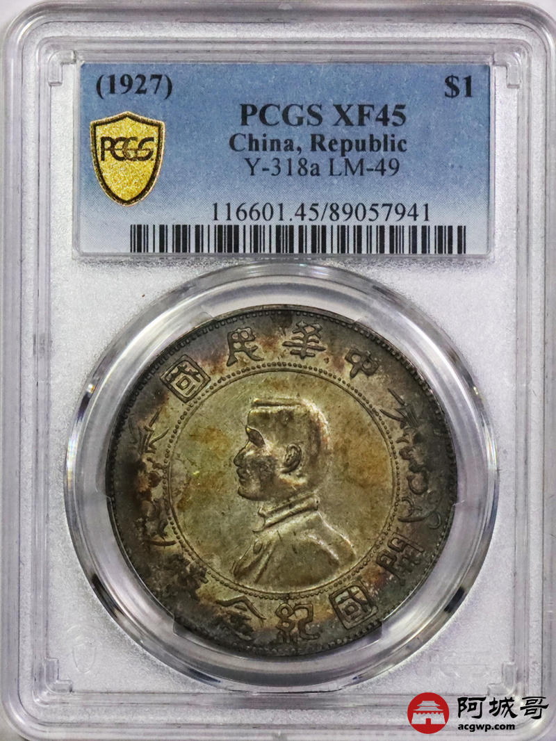 Lot:5115 1927孙中山像开国纪念壹圆银币一枚,原味老五彩 PCGS XF45 评级编号:89057941