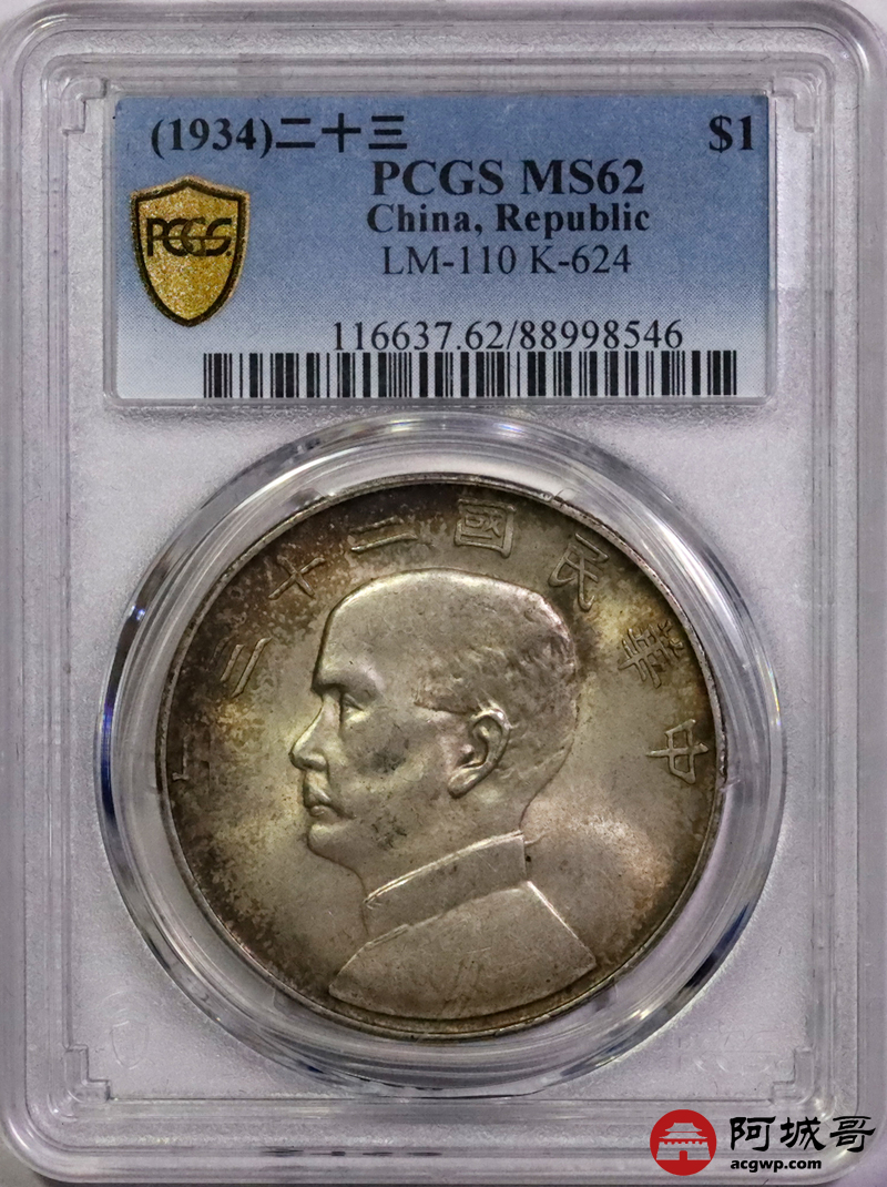 Lot:5140 1934民国二十三年孙中山像背帆船壹圆银币一枚,原光状态,沪上弄堂彩 PCGS MS62评级编号:88998546