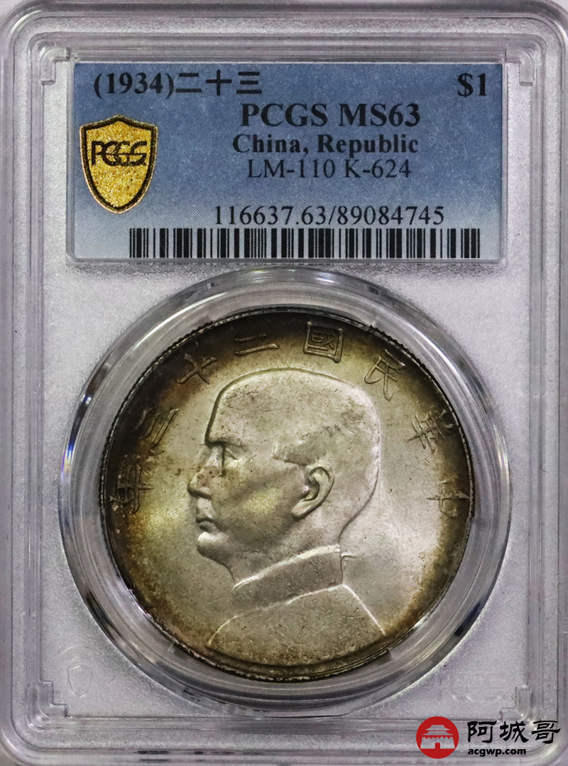 Lot:5135 1934民国二十三年孙中山像背帆船壹圆银币一枚,原光状态,沪上弄堂彩 PCGS MS63评级编号:89084745