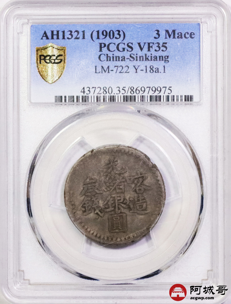 Lot:5343 AH1321(1903)新疆喀什光绪银圆叁钱银币一枚,原味 PCGS VF35评级编号:86979975