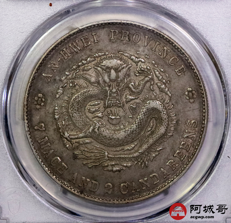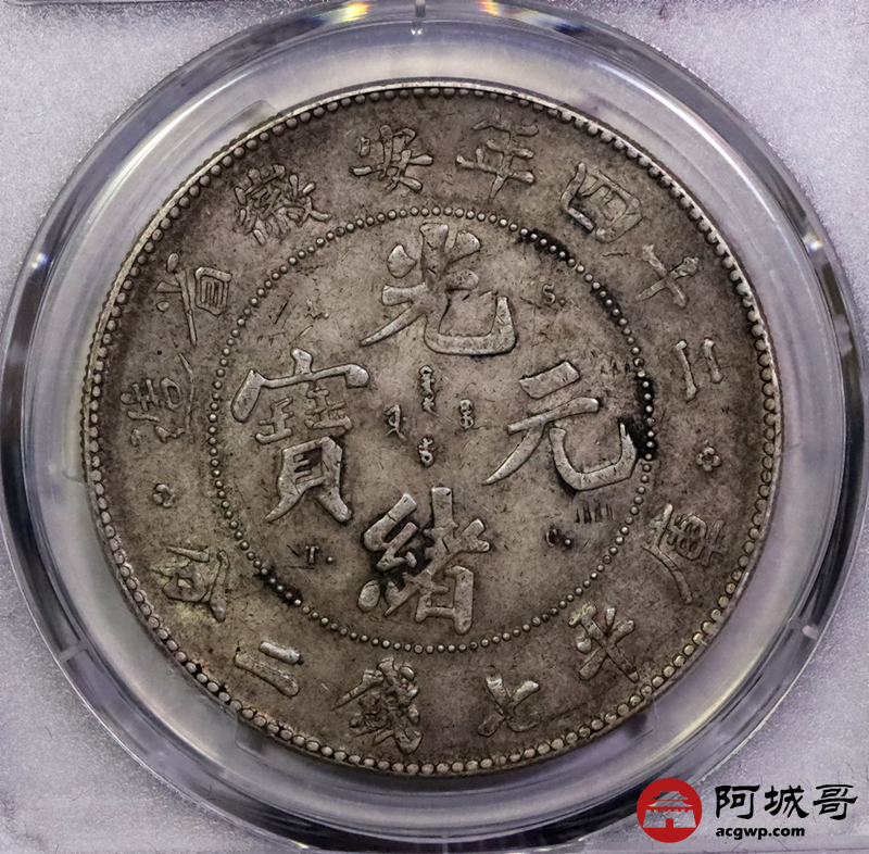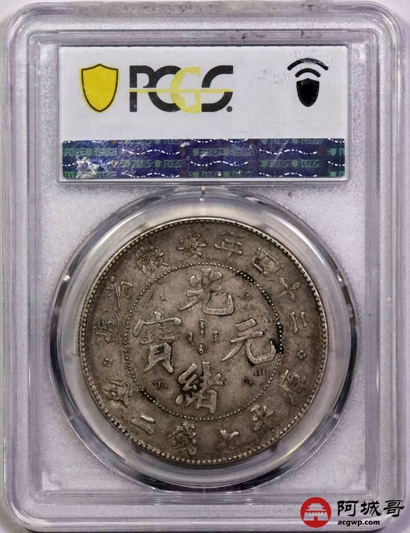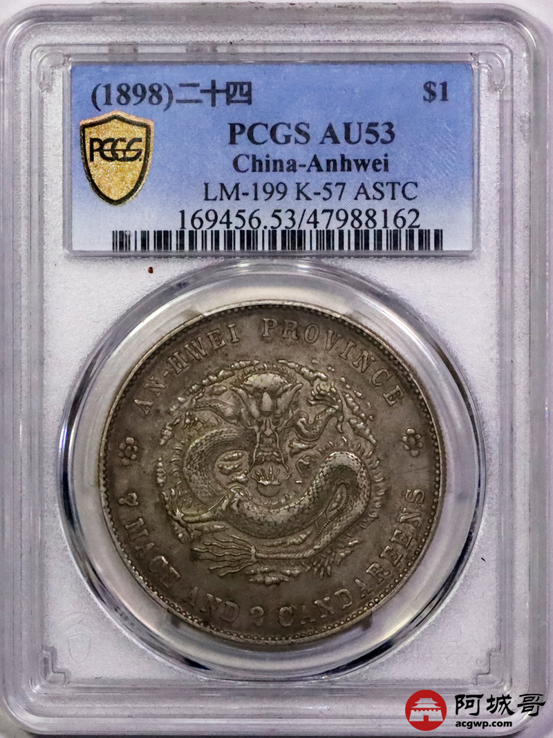 Lot:null 1898光绪二十四年安徽省造光绪元宝库平七钱二分银币一枚,原汁原味,包浆均匀,味道舒服 PCGS AU53评级编号:47988162