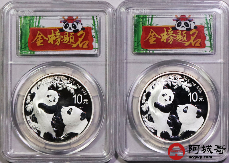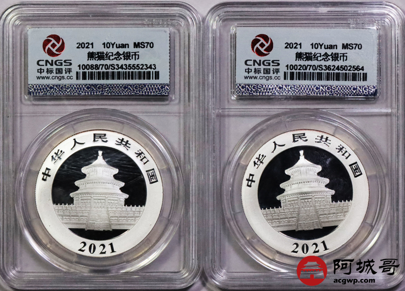 Lot:8 2021年熊猫10元银币两枚 CNGS MS70