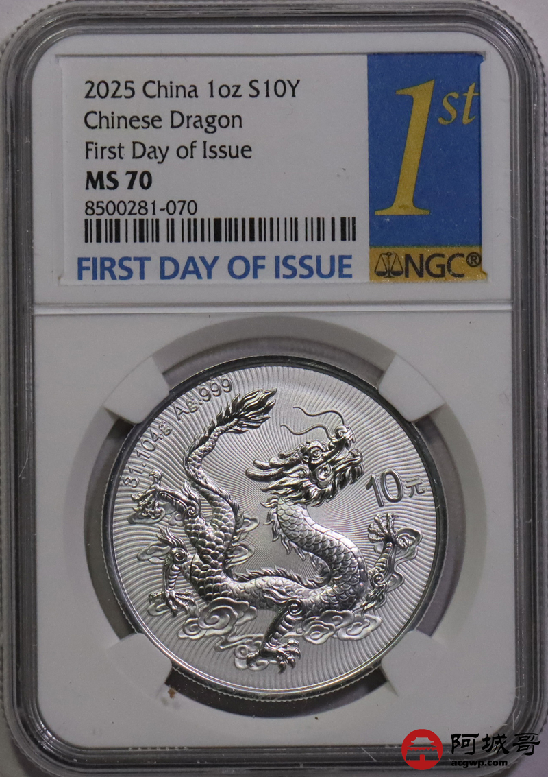 Lot:16 2025年中国龙银币 NGC MS70首日标 银尾龙