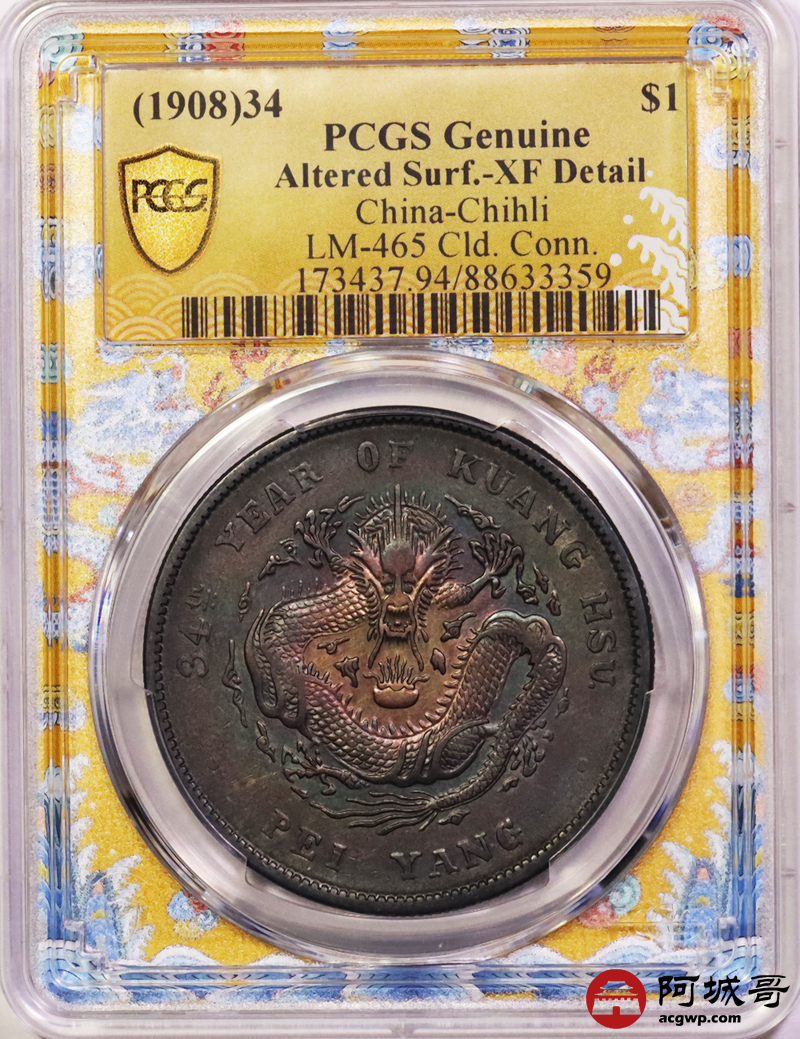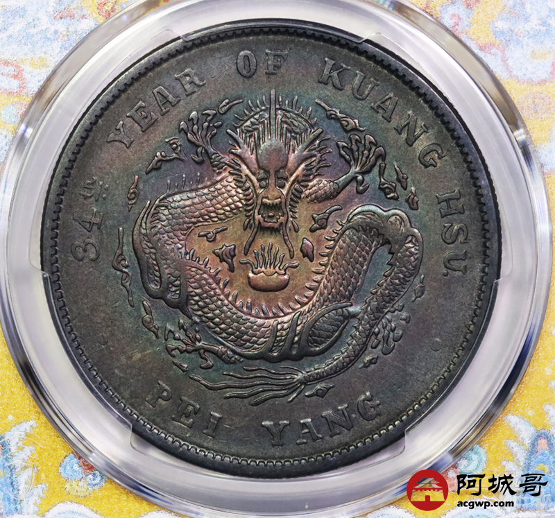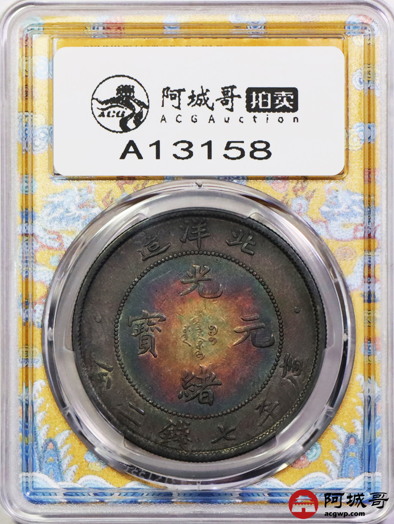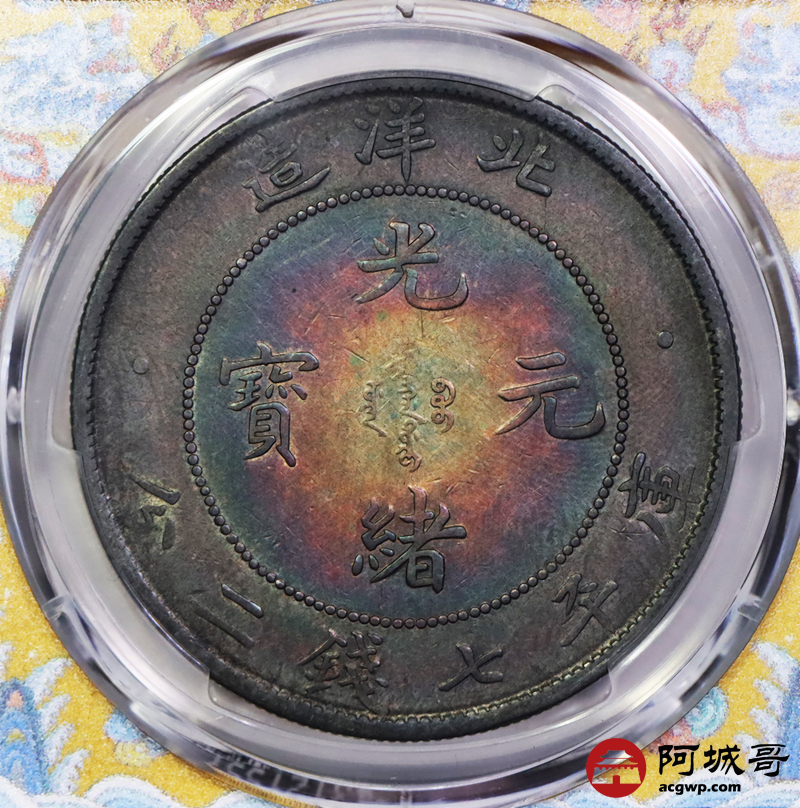 Lot:6447 1908光绪三十四年北洋造光绪元宝库平七钱二分银币一枚,五彩包浆PCGS XF94评级编号:88633359