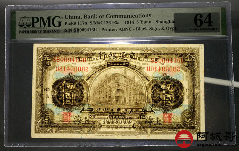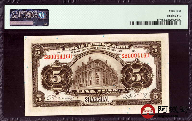 Lot:4 民国三年 交通银行 伍圆 PMG 64