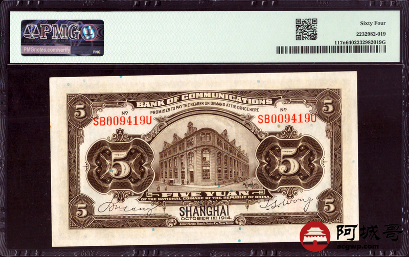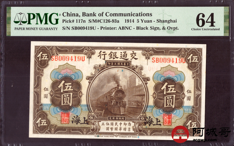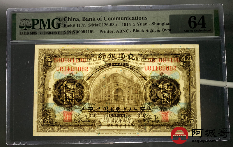 Lot:3 民国三年 交通银行 伍圆 PMG 64