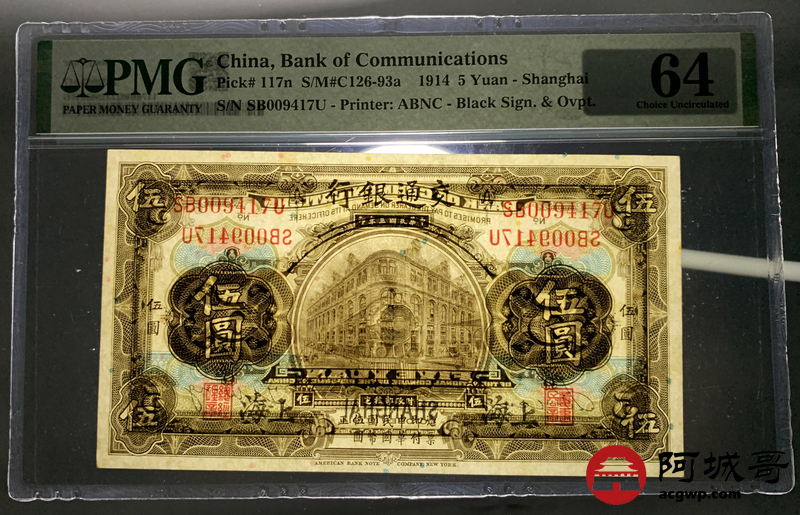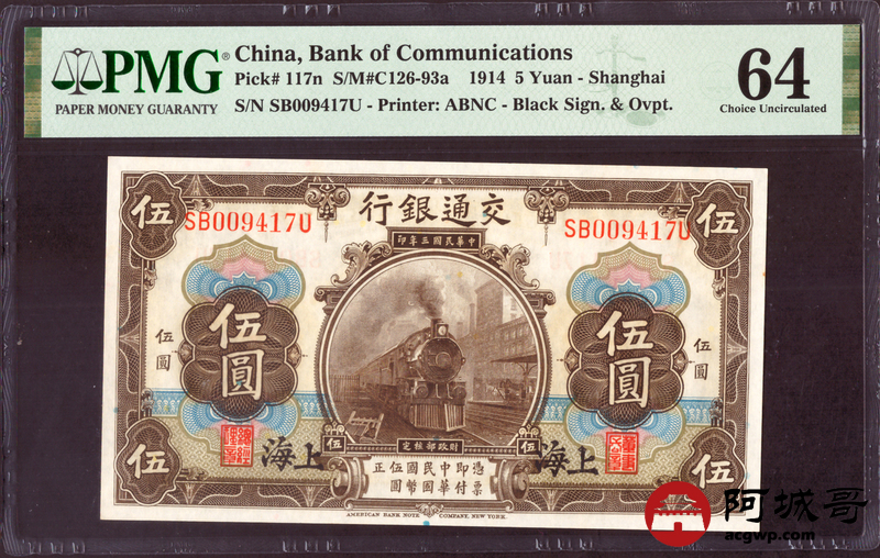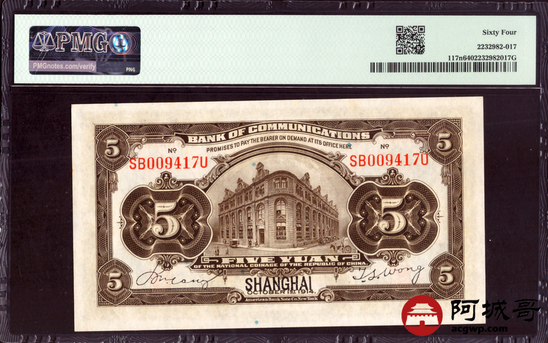 Lot:27 民国三年 交通银行 伍圆 PMG 64