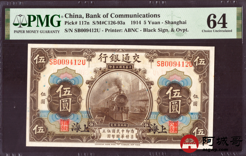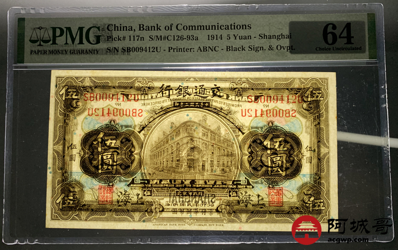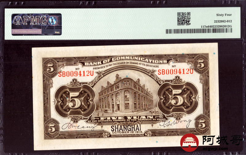Lot:5 民国三年 交通银行 伍圆 PMG 64