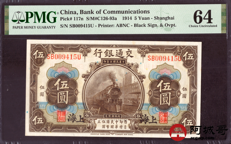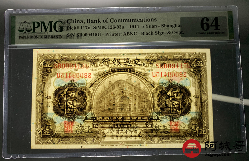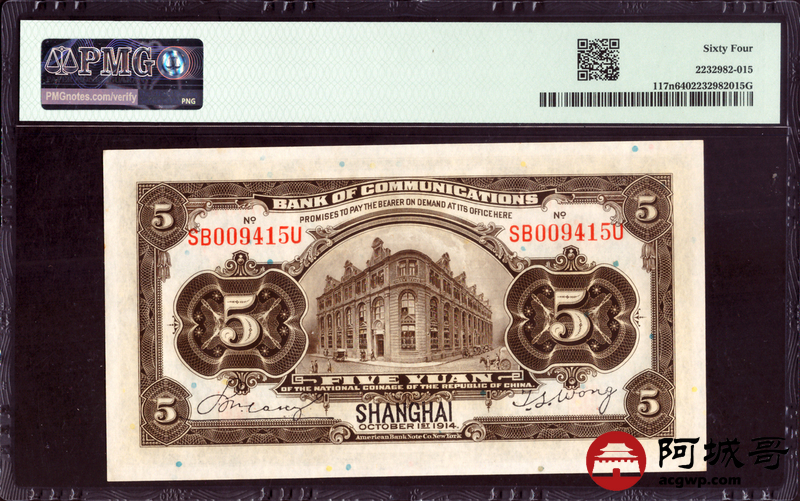Lot:9 民国三年 交通银行 伍圆 PMG 64