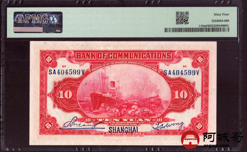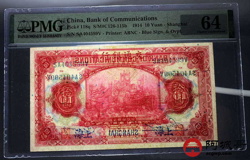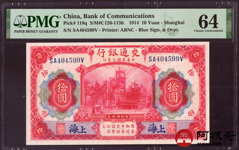Lot:29 民国三年 交通银行 拾圆 PMG 64