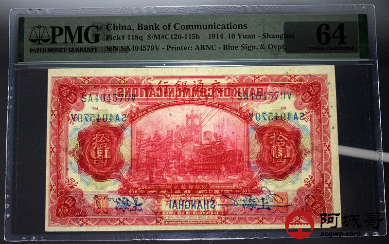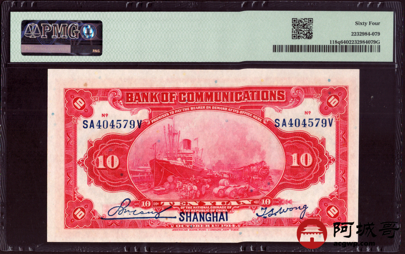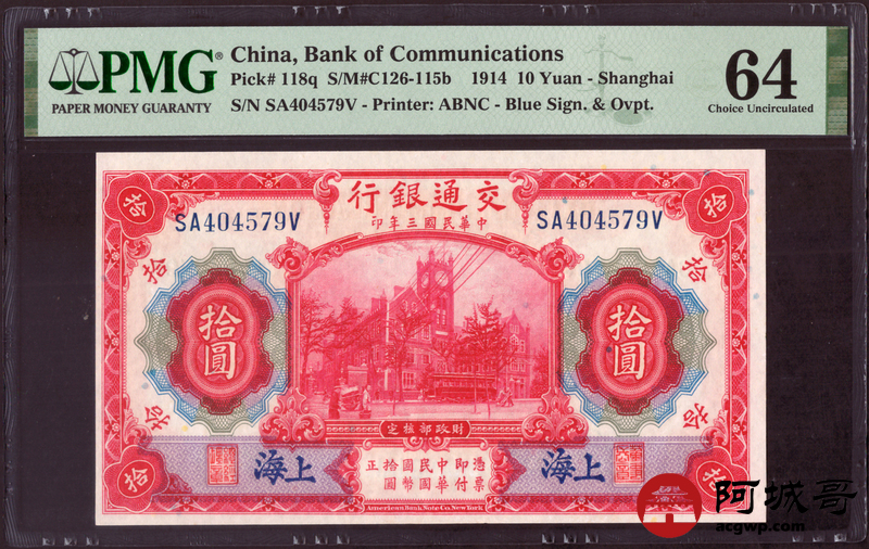 Lot:34 民国三年 交通银行 拾圆 PMG 64
