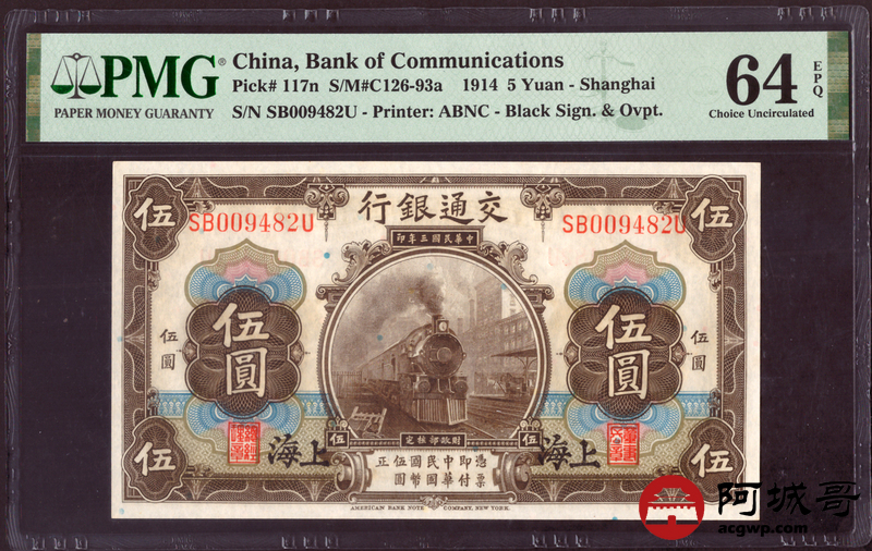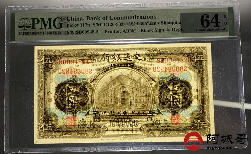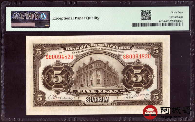 Lot:32 民国三年 交通银行 伍圆 PMG 64