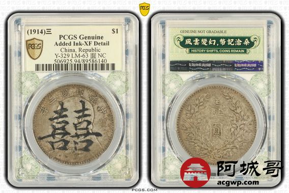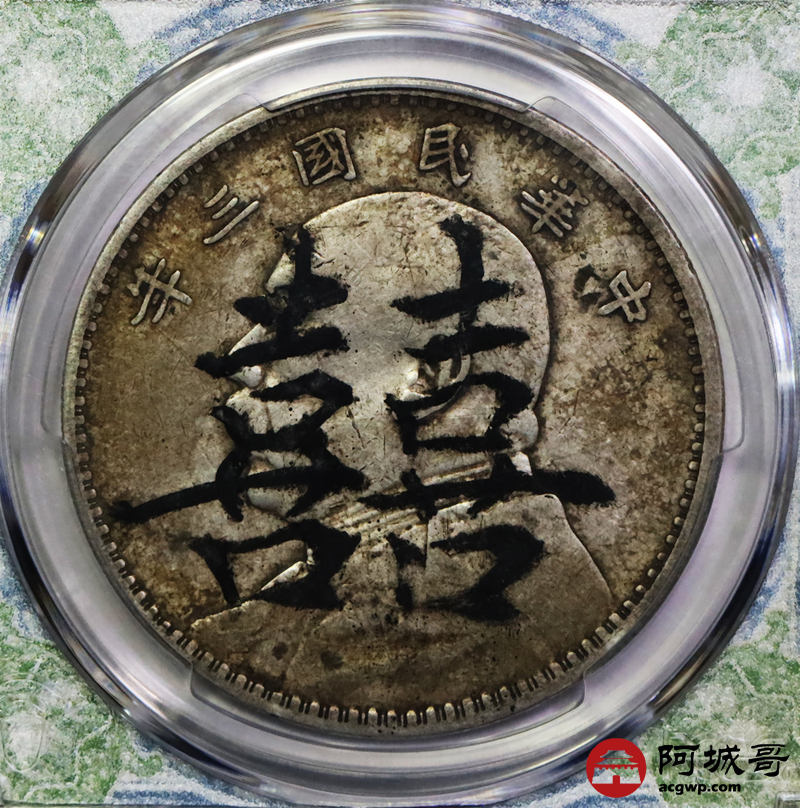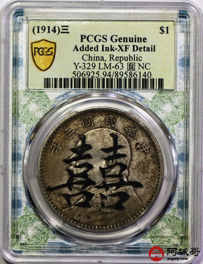 Lot:6 原味老包浆 三年大头壹圆 双囍墨迹 PCGS XF