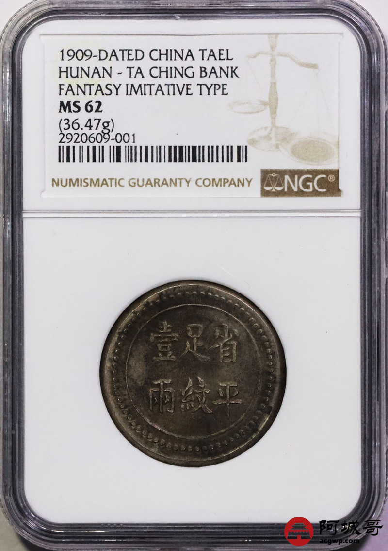 Lot:26 湖南大清银行 省平足纹一两 臆造 NGC MS62