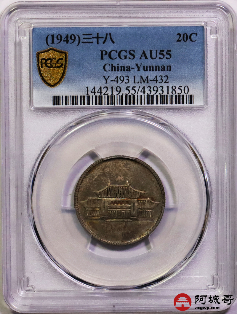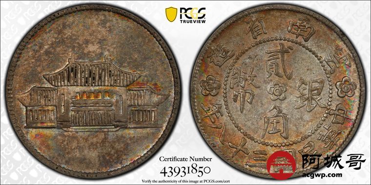Lot:2 深打 五彩包浆 云南胜利堂贰角 PCGS AU55