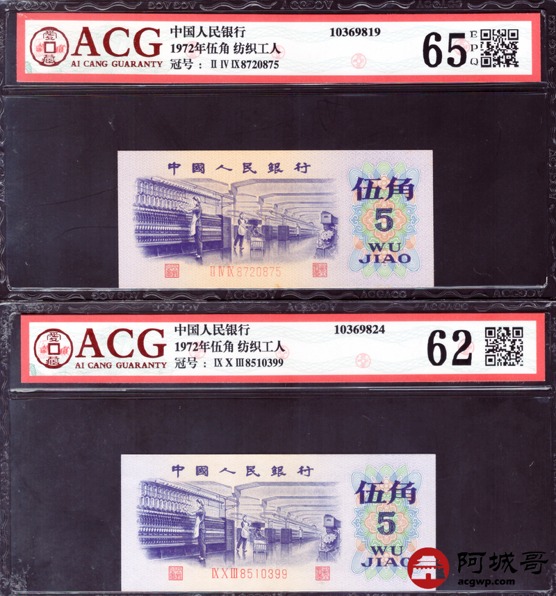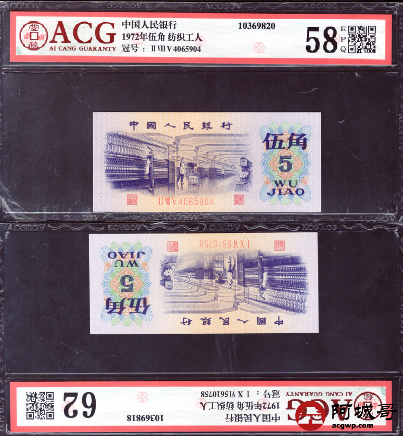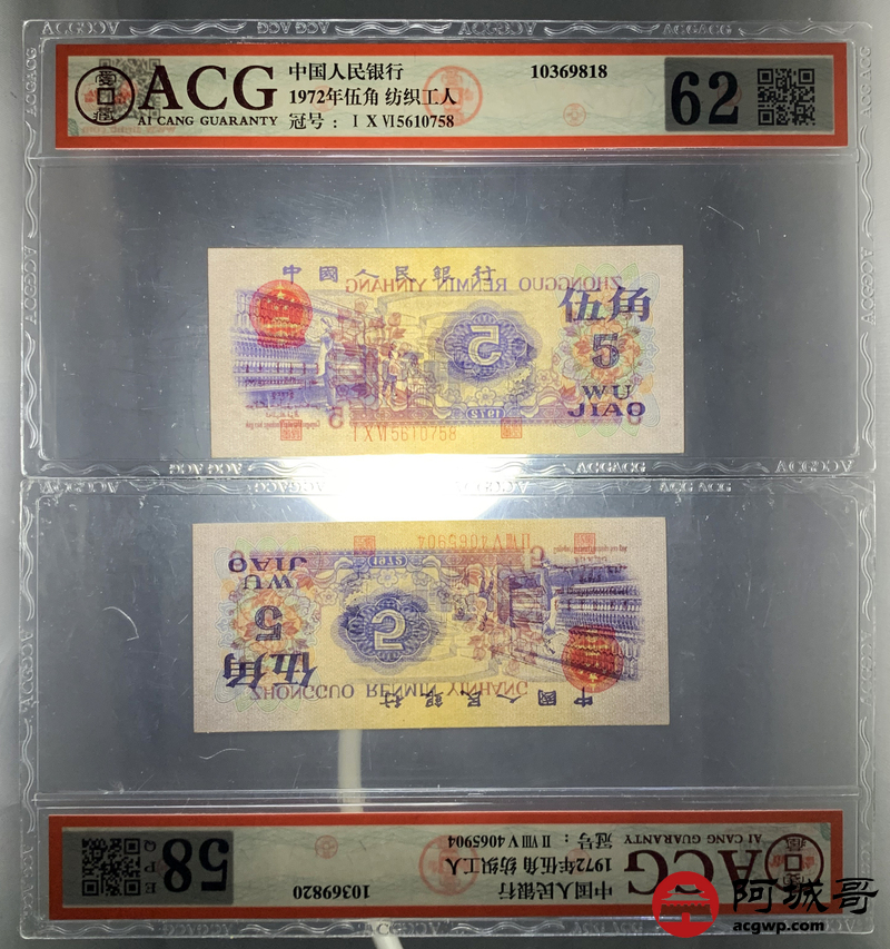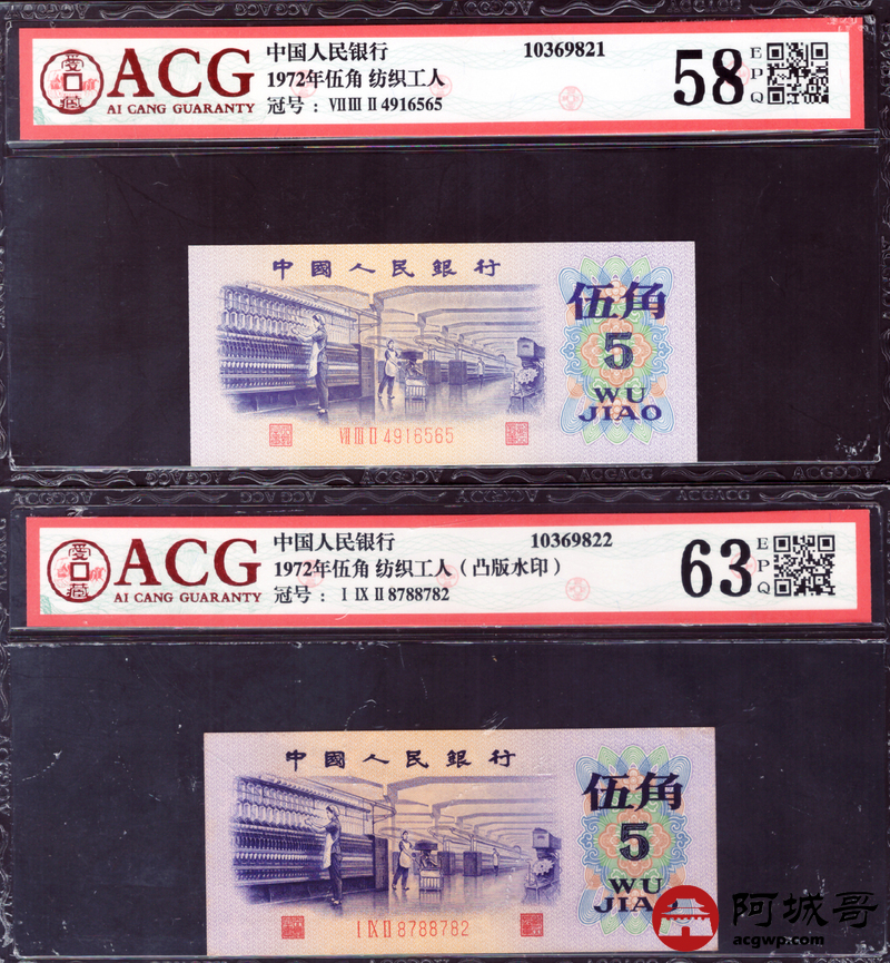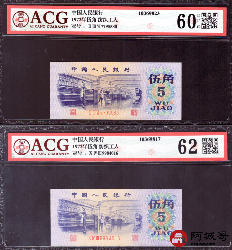 Lot:60 三版 1972 纺织工人 伍角 ACG评级8张一组
