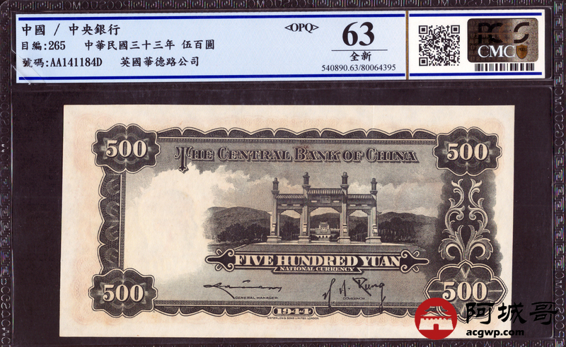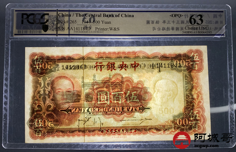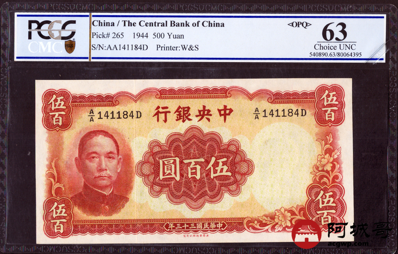 Lot:14 民国三十三年 中央银行伍佰圆 PCGS 63