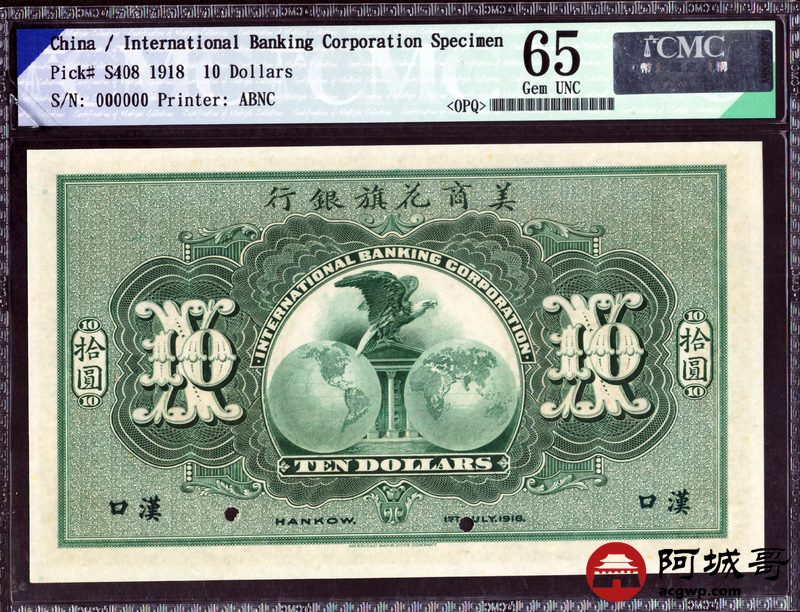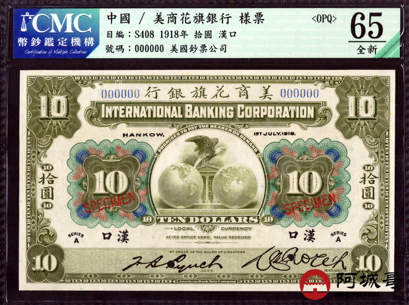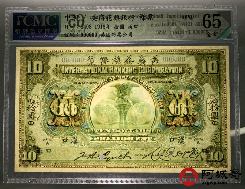 Lot:11 1918年 美商花旗银行 拾元 样票 CMC 65OPQ