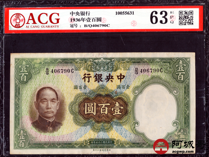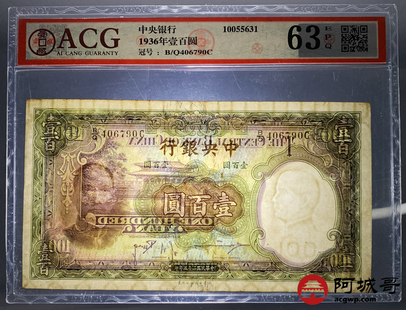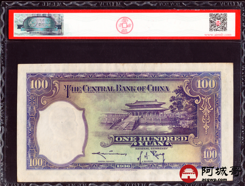 Lot:10 民国二十五年 中央银行壹佰圆华德路版 ACG 63EPQ