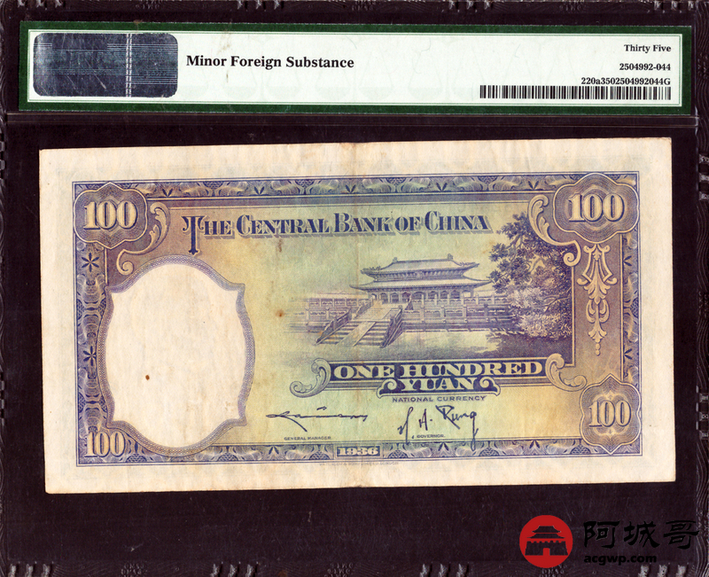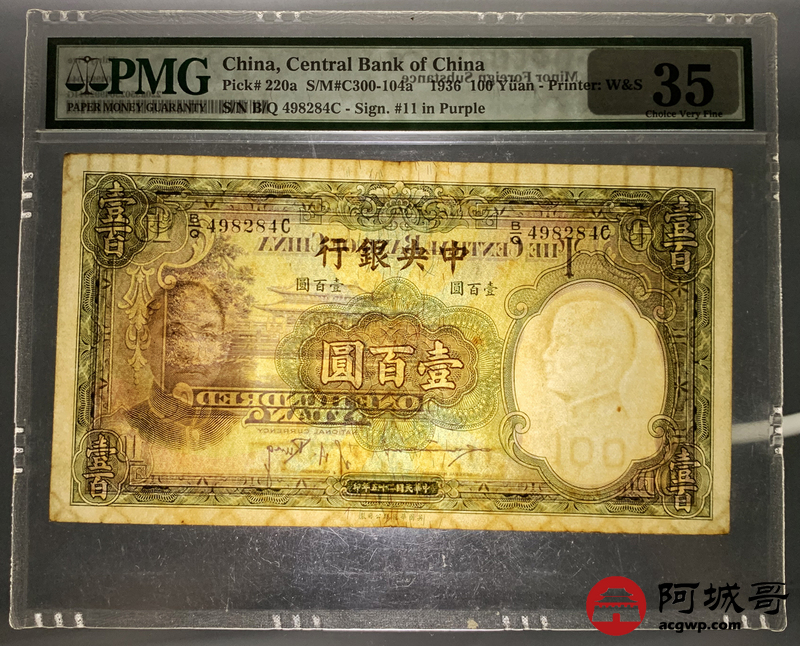 Lot:28 民国二十五年 中央银行壹佰圆 华德路版 PMG 35
