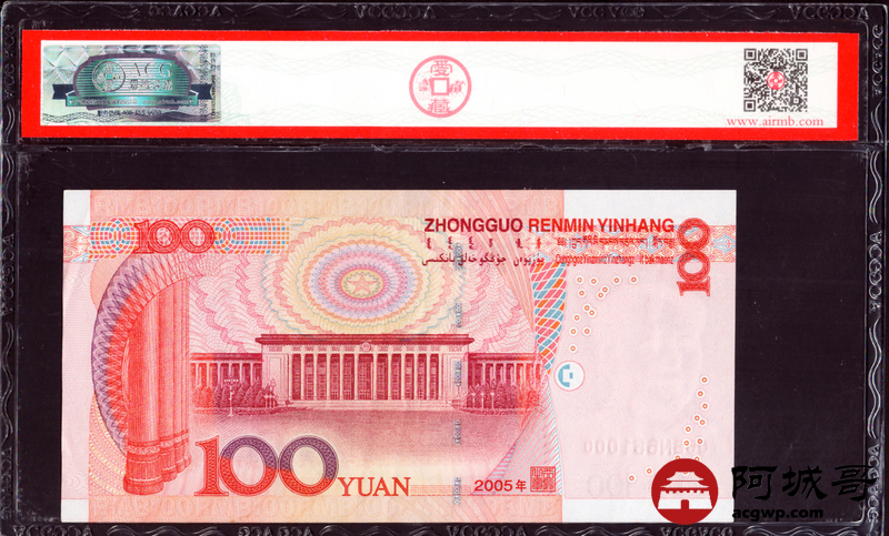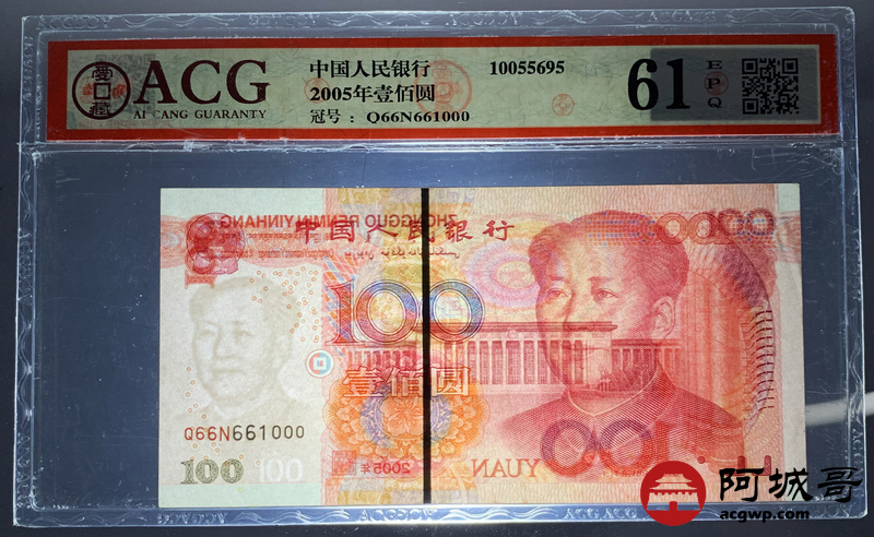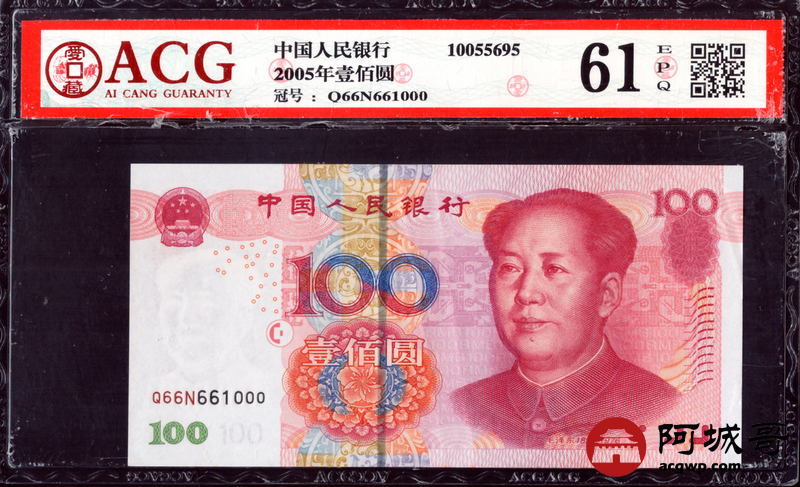 Lot:57 零五年 中国人民银行 100元 ACG 61EPQ 倒置号、尾号豹子号