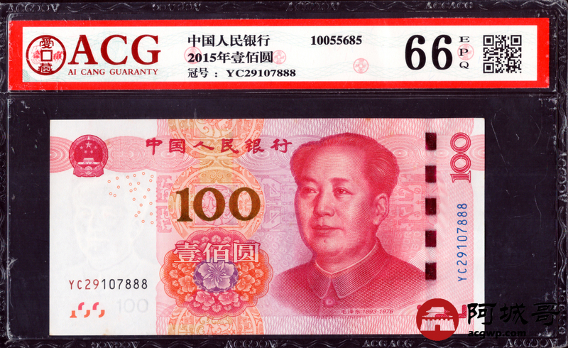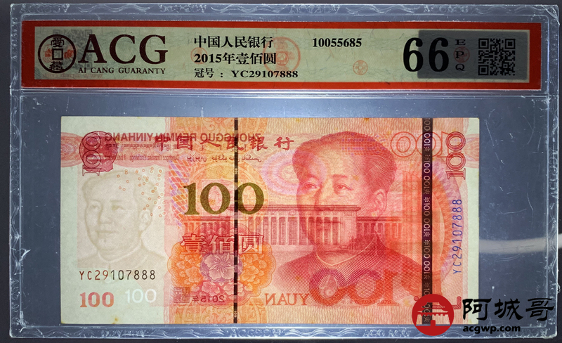 Lot:58 一五年 中国人民银行 100元 ACG 66EPQ 好号无4、尾号豹子号888