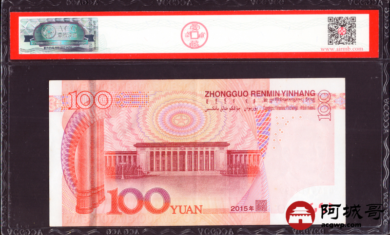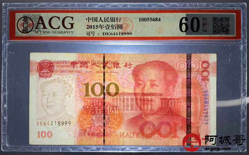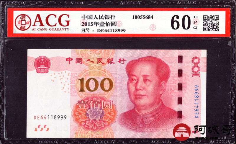 Lot:29 一五年 中国人民银行 100元 ACG 60EPQ 尾号豹子号999