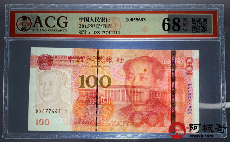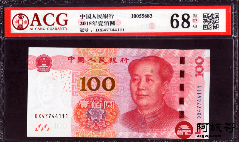 Lot:49 一五年 中国人民银行 100元 ACG 68EPQ 尾号豹子号111