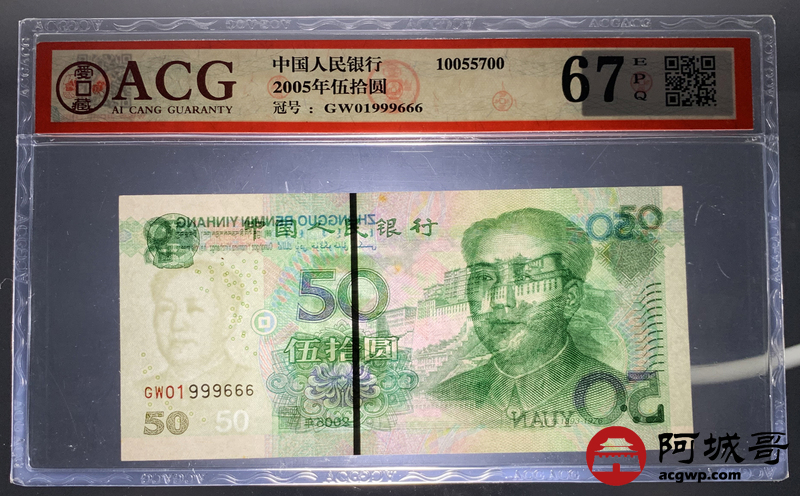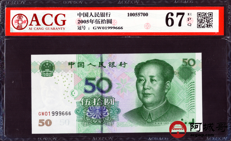 Lot:23 零五年 中国人民银行 50元 ACG 67EPQ 倒置号、尾号豹子号
