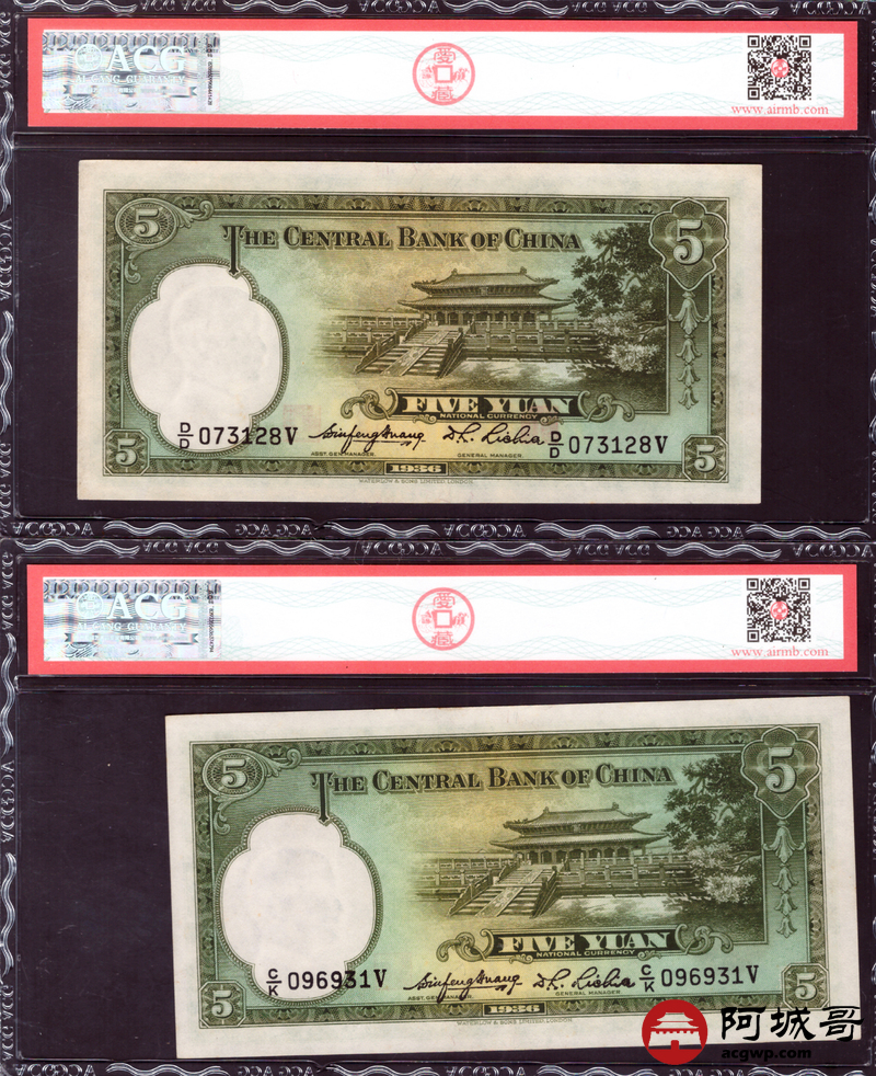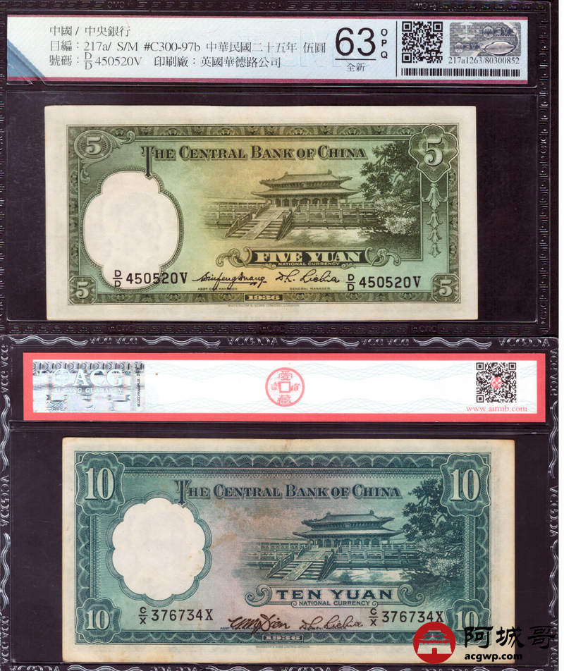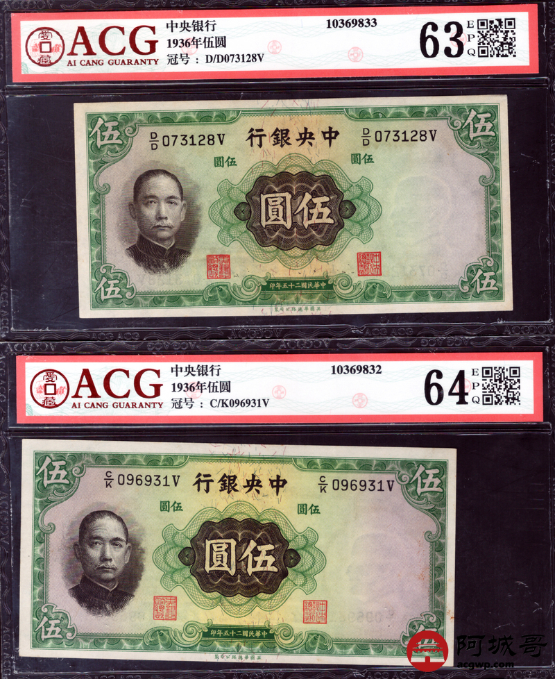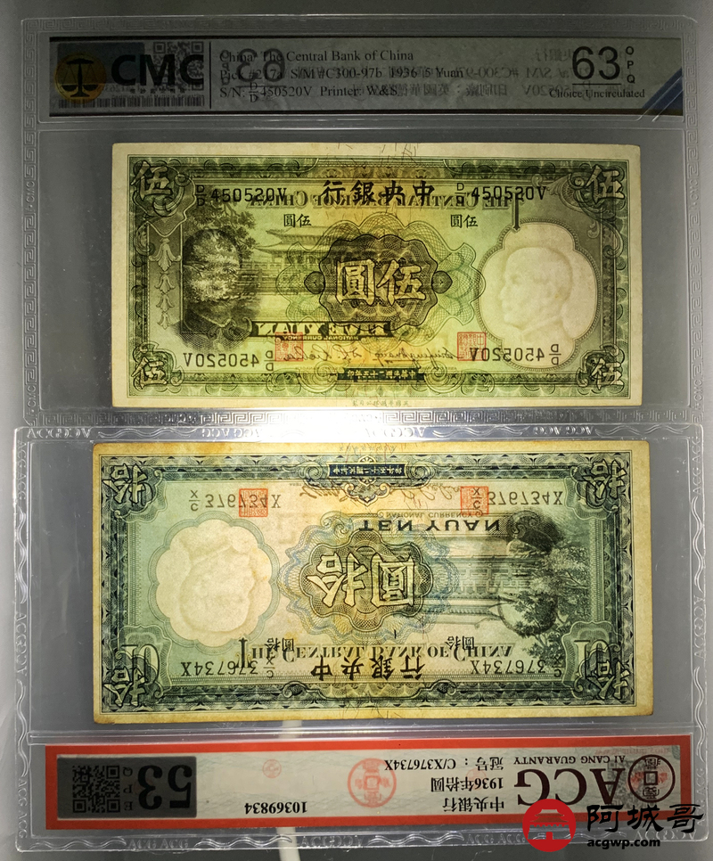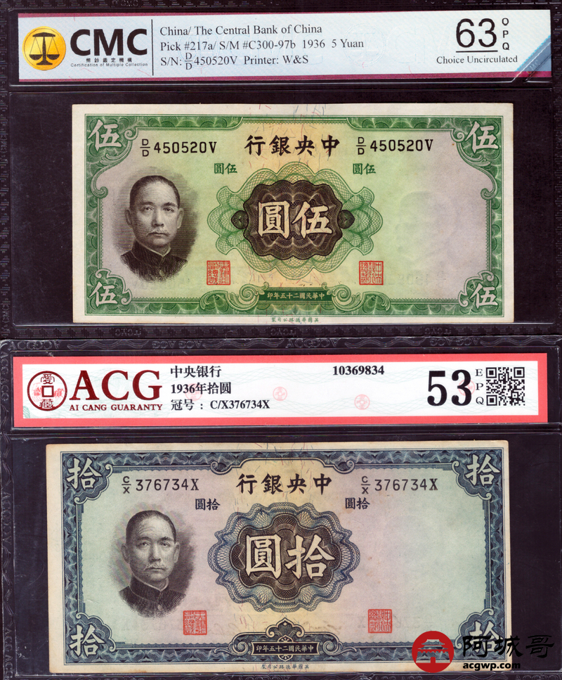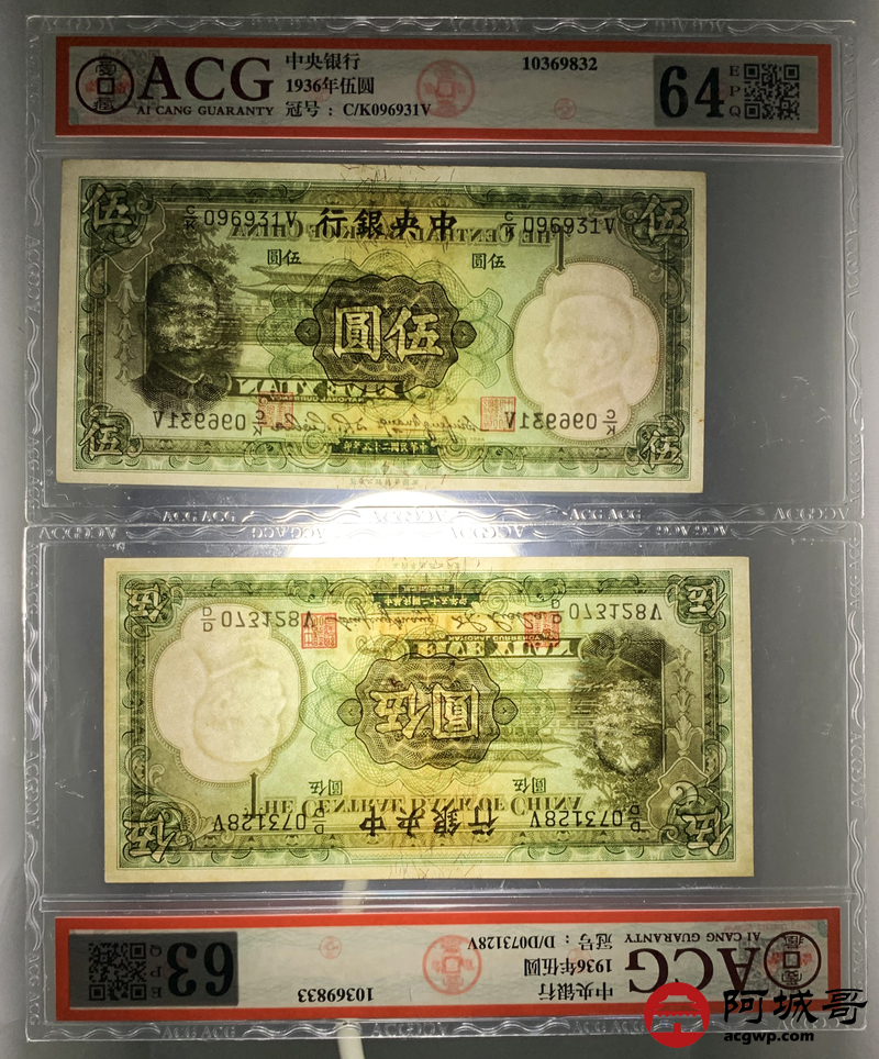 Lot:68 民国二十五年 中央银行 伍圆三张 拾圆一张 ACG 53EPQ、ACG 63EPQ、ACG 64EPQ CMC 63OPQ