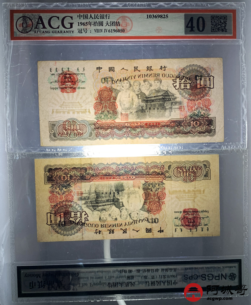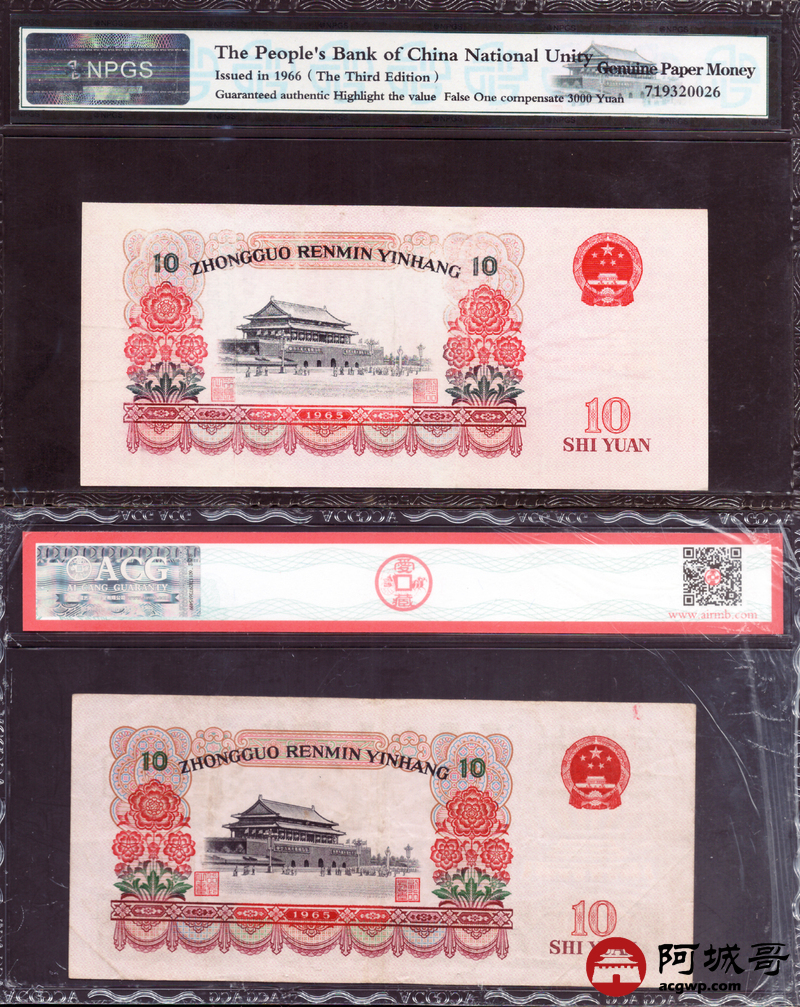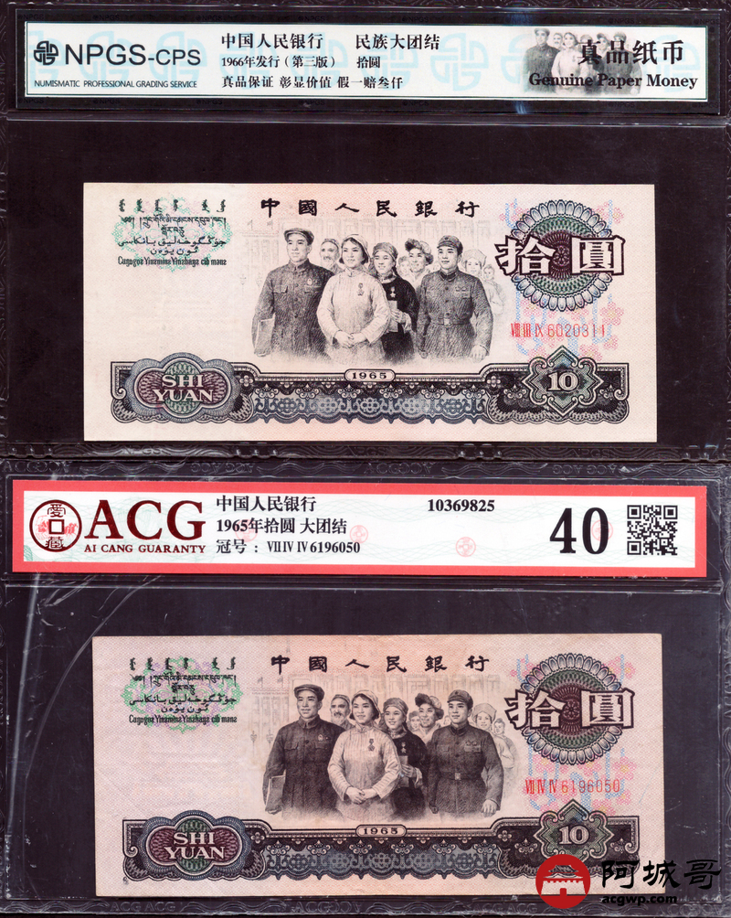 Lot:18 三版 1965年 大团结 10元 两张 NPGS、ACG评级 好号无47