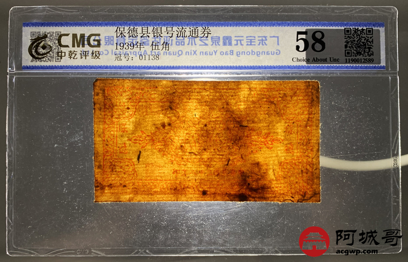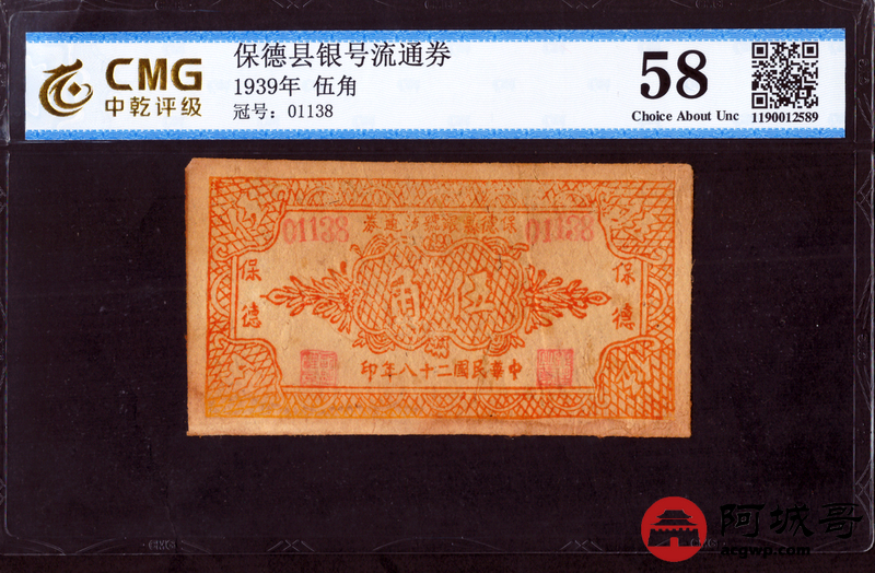 Lot:55 民国二十八年 保德县银号流通券 伍角 CMG 58